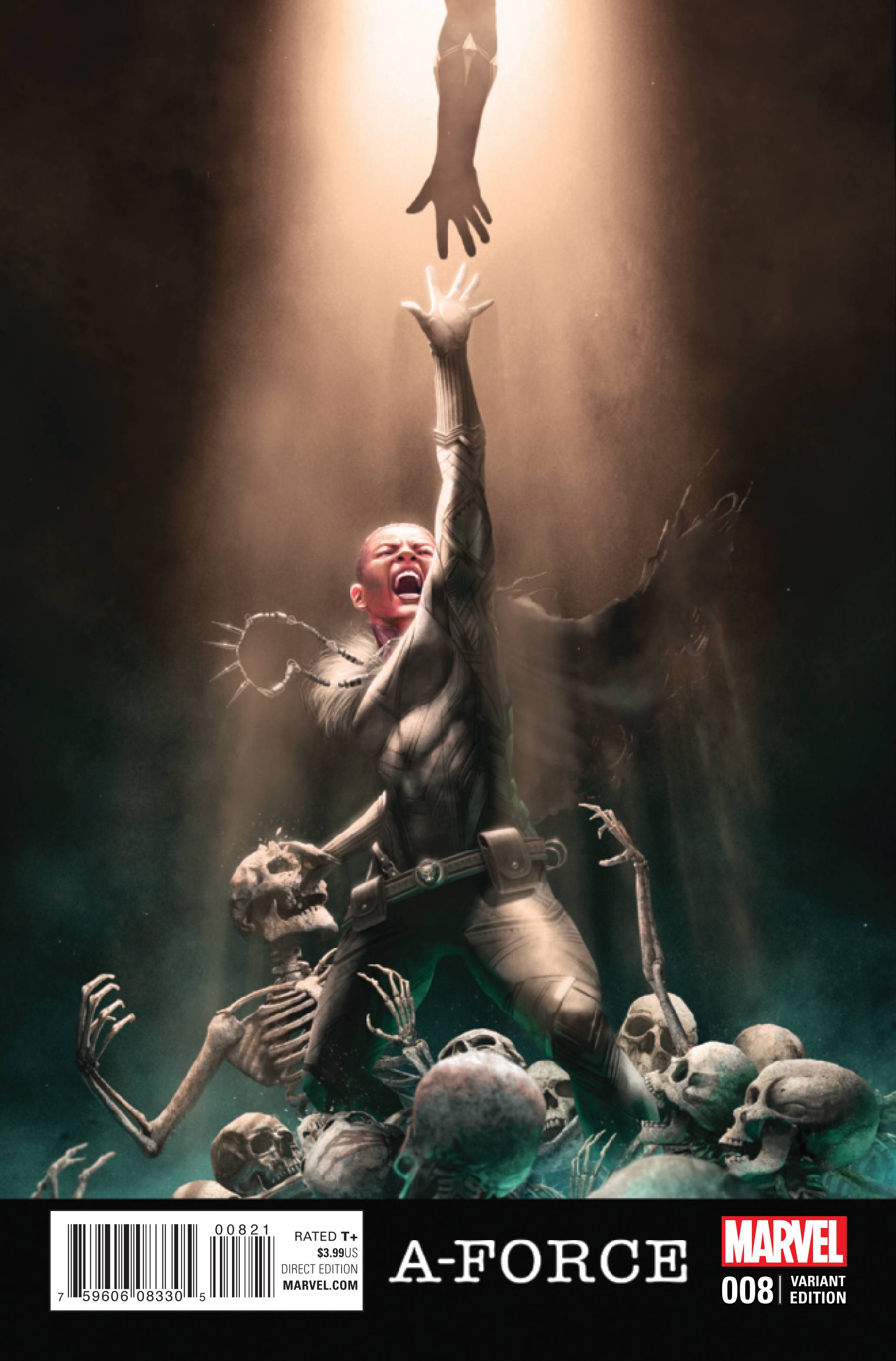 CIVIL WAR II TIE-IN! NEW SERIES ARTIST PAULO SIQUEIRA STARTS HERE! • Civil War has come to A-FORCE! As the team is wrecked by a personal tragedy things only get worse when a predictive vision proclaims one of A-FORCE is a murderer. CAPTAIN MARVEL attempts an arrest, creating a rift that may very well mean the end of the team, and setting in motion a chain of devastating events that affect far more than just A-FORCE. Meanwhile foul-mouthed, gun-toting ELSA BLOODSTONE just unofficially joined A-Force. Looks like we're gonna need a bigger boat...and a verrrrry big black censor bar. Rated T+