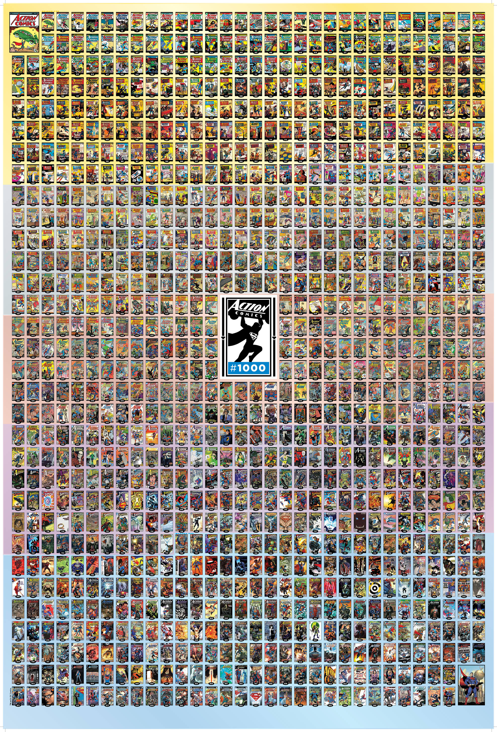 The celebration of the Man of Steel's 80th anniversary continues with the ACTION COMICS: 80 YEARS OF SUPERMAN POSTER! Originally slated to run in the ACTION COMICS: 80 YEARS OF SUPERMAN HC, this poster is now offered as a stand-alone item. This spectacular poster features every ACTION COMICS cover ever, from the series' 1938 debut to issue #1000, coming in April! The poster measures 27" x 40".