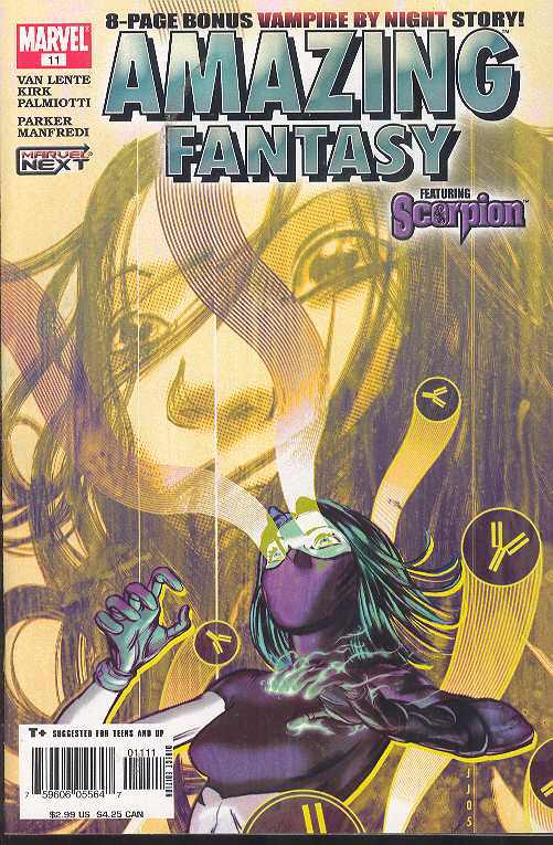 Written by FRED VAN LENTE AND JEFF PARKER Penciled by LEONARD KIRK AND FEDERICA MANFREDI Cover by JAMES JEAN "THE NEW POLLUTION" She's been marked for death by S.H.I.E.L.D., her cover has nearly been blown by AIM, and she's said goodbye to the one guy she really liked... Is all-new Scorpion down for the count? Don't bet on it! 22 pages of all-out, action-packed espionage the Marvel way! Part 5 (of 6) ALSO: More secrets revealed of Marvel's newest horror star, Vampire by Night, in a bonus 8-page story!