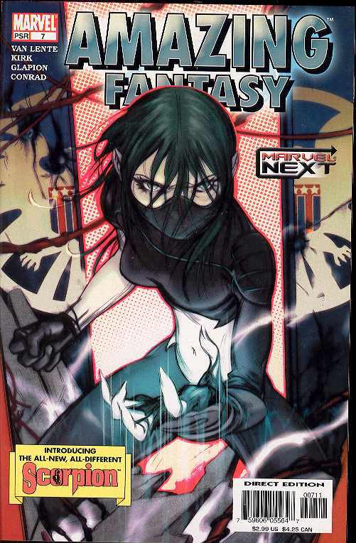 Written by FRED VAN LENTE Penciled by LEONARD KIRK Cover by JAMES JEAN The fans spoke and Marvel listened. The winner of the Marvel.com poll for characters fans wanted to see revamped makes her astonishing debut! Amazing Fantasy #7 is proud to present the all-new, all-different SCORPION! After the vicious murder of her adoptive parents, Carmilla Black discovers her biological mother is the top scientist of the worldwide terrorist network, A.I.M. Now, to unravel the secrets of her true identity and mysterious power, she's hot on the heels of her enigmatic mother, with S.H.I.E.L.D. hot on her trail, hoping she'll lead them right to the terrorists' leadership! Part (1of 6)
