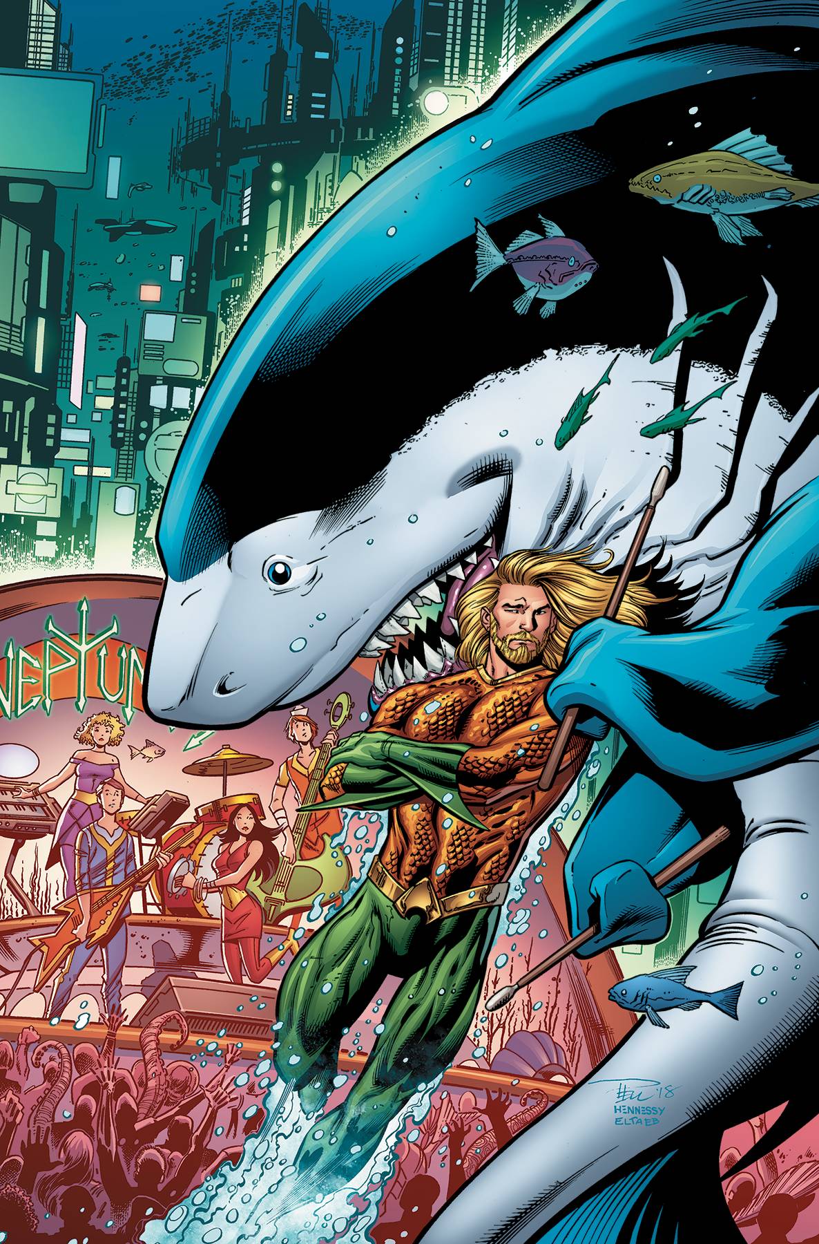 When the town of Amnesty Island is besieged by a series of shark attacks, authorities call Aquaman for help! What's unusual about this case is that the shark isn't trying to kill people-he just wants to talk to them. The very confused Jabberjaw needs to get back to Aqualand, the future undersea utopia where he came from. But that peaceful city where man and sentient sea life have been living in harmony has been turned into a dystopian nightmare created by a new Ocean Master. Now the King of Atlantis and his friendly shark ally have to team up to set things right. Also includes a Captain Caveman meets the wizard Shazam in a short story by Jeff Parker and Scott Kolins.