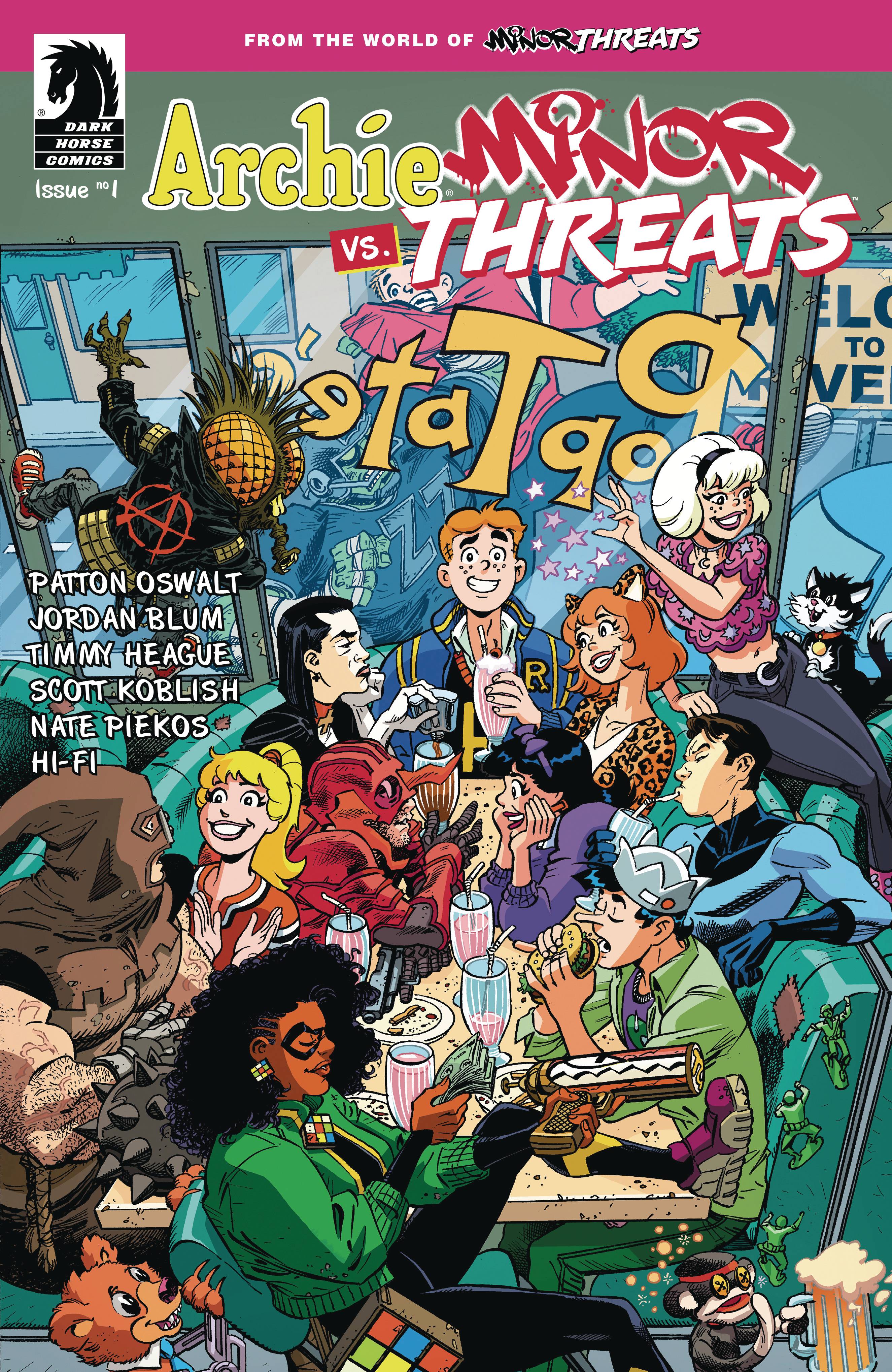 Not a hoax! Not a dream! The fun-loving teens of Riverdale collide with the crooked super-criminals of Twilight City in the most bombastic crossover of the year! It's your favorite high schoolers forced to FIGHT your favorite costumed villains in a story that will have lasting ramifications on all involved! ARCHIE, BETTY, VERONICA, JUGHEAD and friends are on on their way to a field trip to Twilight City when the magical meddling of SABRINA THE TEENAGE WITCH lands them in the seedy underbelly of Redport, the most villainous part of town controlled by Frankie Follis AKA PLAYTIME and her gang of MINOR THREATS. Archie and the others suddenly find themselves drafted into both sides of the war Playtime is waging against magic users in her turf. One thing is for sure . . . blood and milkshakes will be spilled! Issue one of the four issue mini is written by Minor Threats co-creators Patton Oswalt and Jordan Blum with Timmy Heague (Archie Comics' Fear the Funhouse: Toybox of Terror) and art by Scott Koblish (Deadpool). • Four issue series.
