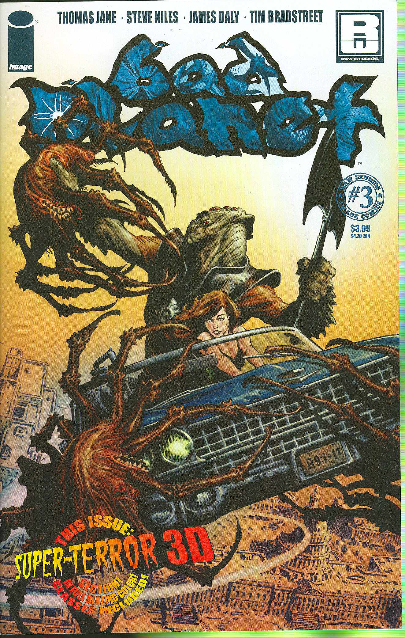written by STEVE NILES & THOMAS JANE art by LEWIS LAROSA & TIM BRADSTREET cover by MARK SHULTZ The Phaedon Warrior makes his way to Earth, and Veronica Falcon thinks he may hold the key to stopping the Alien Beasts. But will the escaped alien convict want to lend a hand? Or is he here to revel in the destruction? PRODUCT UPDATE (080107): Issue #3 now includes a pair of 3-D glasses with every copy. Because of this addition, the price of the book has changed from $2.99 to $3.99. The title is eligible for order adjustments in the 8-1-07 issue of Dateline.