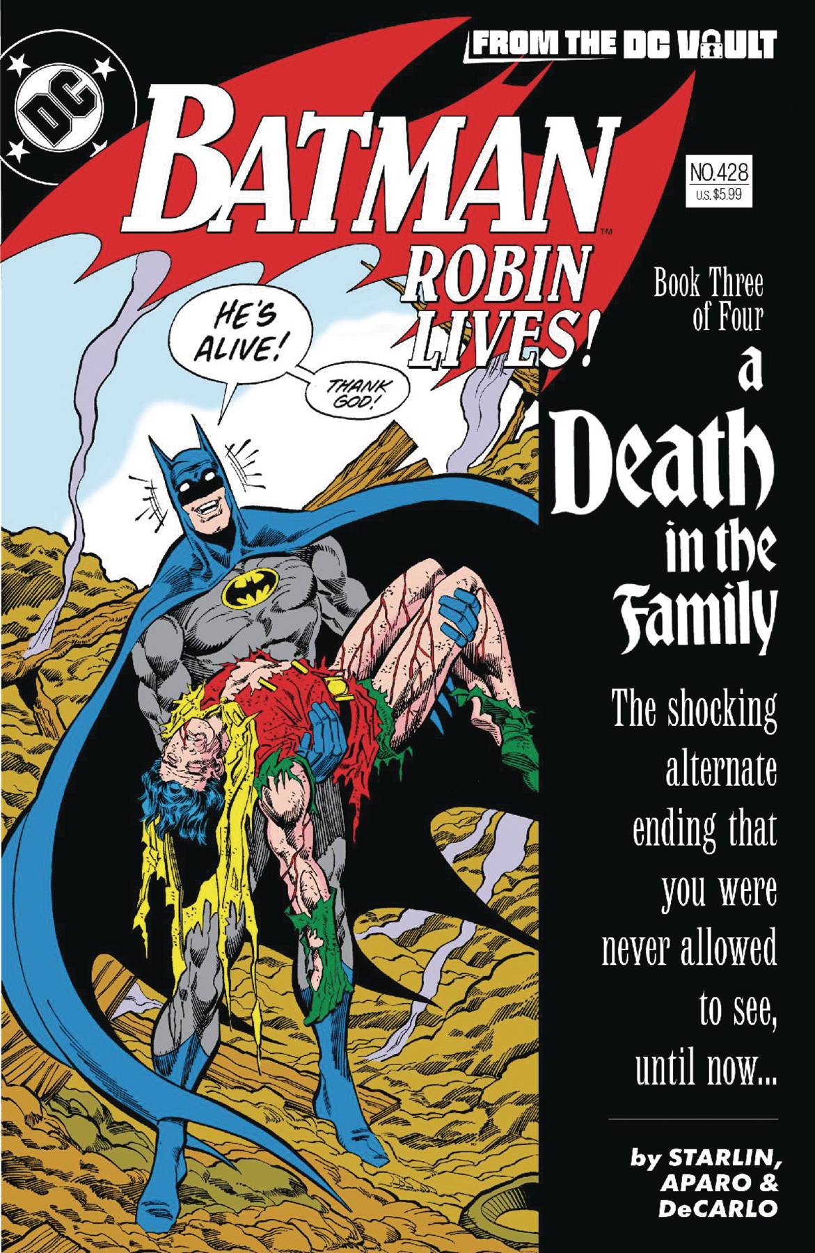 (W) Jim Starlin (A) Jim Aparo, Mike Decarlo (CA) Jim Aparo FINALLY REVEALED! FROM THE DC VAULT: THE UNPUBLISHED ALTERNATE ENDING TO A DEATH IN THE FAMILY IN WHICH JASON TODD SURVIVES HIS ENCOUNTER WITH THE JOKER! What if one of the darkest hours in Batman's crime-fighting career never happened? Thirty-five years ago, fans voted on Jason Todd's fate after his brutal encounter with The Joker, which set Jason on the path to becoming the gun-toting vigilante Red Hood. But suppose fans had voted differently... DC Comics transports you back in time with this special faux-simile edition of Batman #428 in which Robin lives! Featuring pages reconstructed from artist Jim Aparo's alternate art boards--which have been plucked from the DC vault and fully restored and remastered--this reedited version of A Death in the Family, Book Three turns the Dark Knight's greatest tragedy into a moment of triumph. Adding to the immersive authenticity of this alternate-history comic book, this version includes all the ads from the original 1988 edition plus a rewritten letters column.