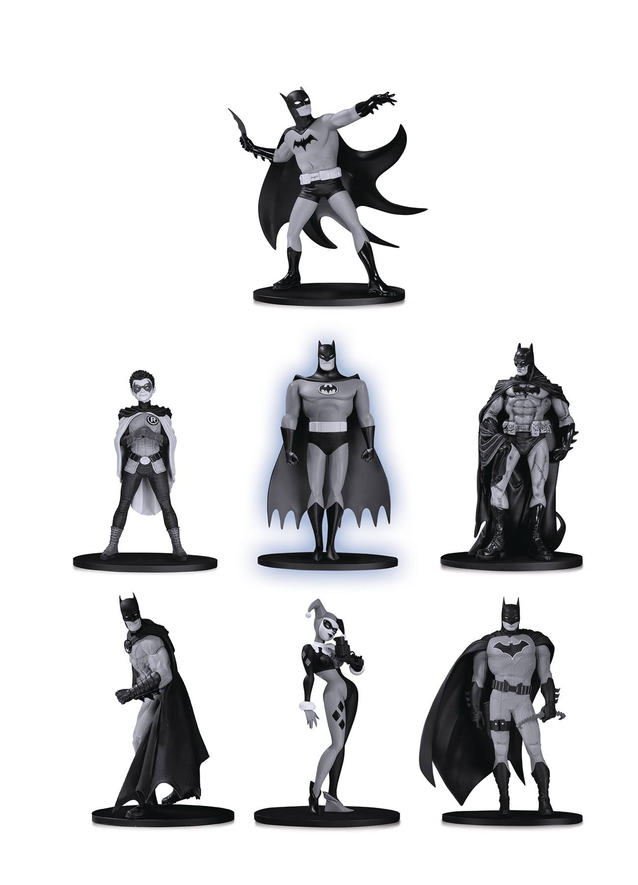 DC Collectibles' long-running statue line, BATMAN: BLACK AND WHITE, has captured the hearts of collectors and comics fans alike with its interpretations of the World's Greatest Detective and select Gotham City characters by the industry's brightest stars. Starting in 2019, DC Collectibles is creating an all-new offshoot of the beloved black-and-white collectibles line, this time offering 3.75" tall PVC figures. Released in sets of seven, including resized rereleases of some of the most popular statues in the line's history, each set will come with six previously available mini figures plus one exclusive, never-before-released edition only available in this set. Coming in July 2019, Box Set Two features figures from: (All figures are Batman unless otherwise noted.) - Bruce Timm (Harley Quinn) - Frank Quitely (Robin) - Mike Allred - John Romita Jr. - Gary Frank - Eduardo Risso - An exclusive mini figure based on the beloved Batman: The Animated Series Dark Knight • Figures measure approximately 3.75" tall • Allocations may occur • Final products may differ from images shown • Approximately 6 units per carton