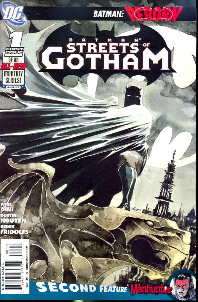 Written by Paul Dini and Marc Andreyko Art by Dustin Nguyen & Derek Fridolfs and Georges Jeanty & Karl Story Cover by Dustin Nguyen Variant cover by JG Jones An all-new Batman series by the DETECTIVE COMICS creative team of Paul Dini and Dustin Nguyen! As a new Batman rises on the streets of Gotham City, the heroes, villains and citizens take notice. How will the police feel about this new Batman, and can he control the crime in Gotham the way the old Batman did? This new series also features a regular ongoing co-feature starring Manhunter written by Marc Andreyko and illustrated by Georges Jeanty (Buffy Season 8)! Kate Spencer lost a friend during the chaos of BATTLE FOR THE COWL, and now she wants payback. As usual, she'll use any means necessary to get it! Retailers please note: This issue will ship with two covers. For every 25 copies of the Standard Edition (with a cover by Dustin Nguyen ), retailers may order one copy of the Variant Edition (with a cover by JG Jones). Please see the Previews Order Form for more information. On sale June 17 40 pg, FC, $3.99 US
