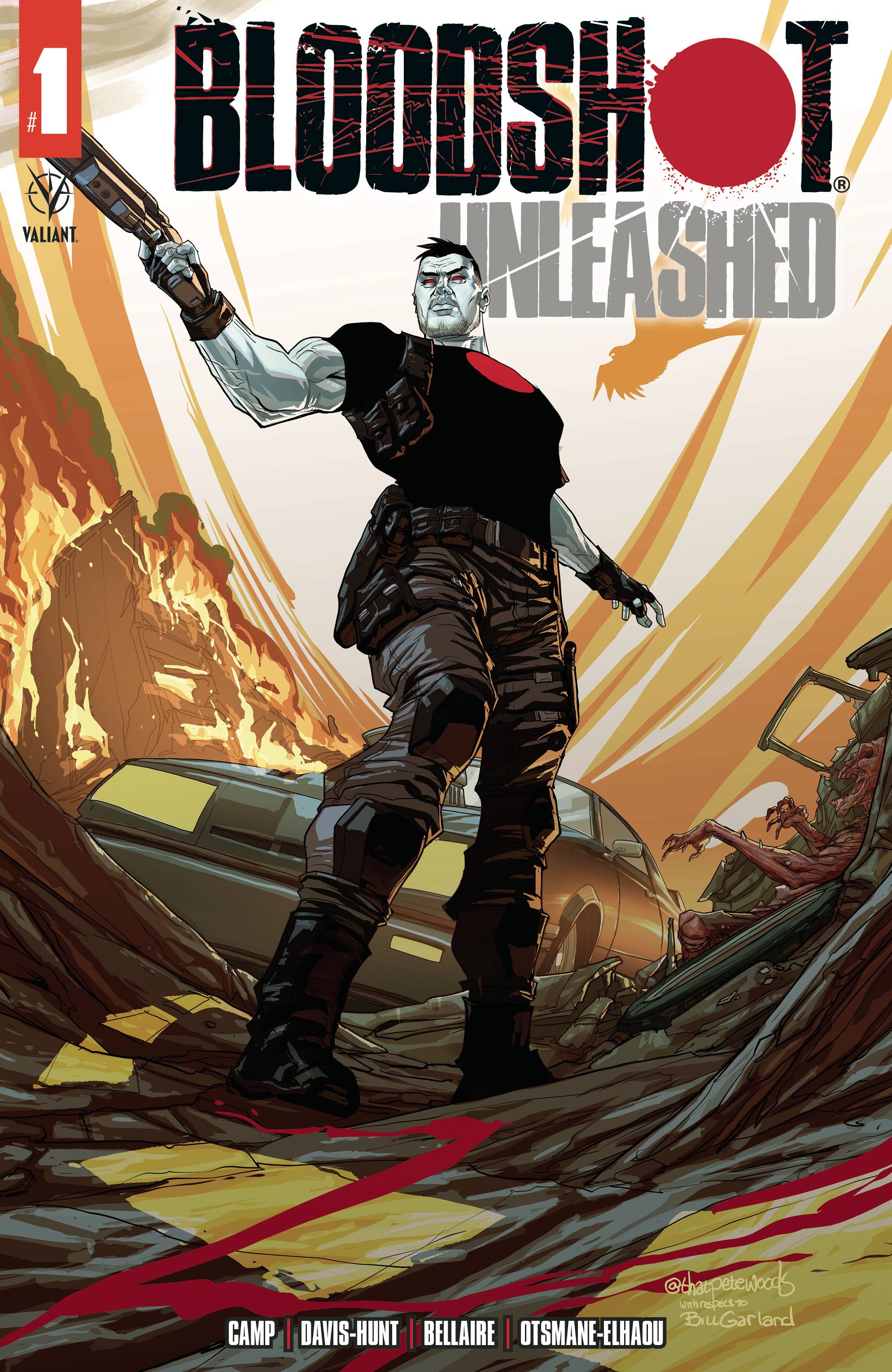Dangerous super soldiers and bloodthirsty living weapons have mysteriously escaped into the world to wreak havoc across the dying towns and forgotten farms of America. Now, Bloodshot must take up arms again to travel across the country hunting down these violent monsters, battling his own demons, and defending the most defenseless. Deniz Camp (Agent of W.O.R.L.D.E.) and Jon Davis-Hunt (SHADOWMAN) join forces to unleash Valiant Entertainment's first Mature Readers title that puts the BLOOD in BLOODSHOT.