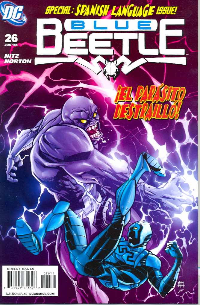 Written by Jai Nitz Art by Mike Norton & Trevor Scott Cover by Zach Howard A special extra-sized Spanish-language issue, with the English script as bonus material! Blue Beetle takes Traci 13 to his family reunion, and having your girlfriend meet your family can be tough, especially when she's the only guest who doesn't speak Spanish! To make matters worse, two people have uncovered Jaime's secret identity - and one of them is the Parasite! On sale April 30 40 pg, FC, $3.50 US