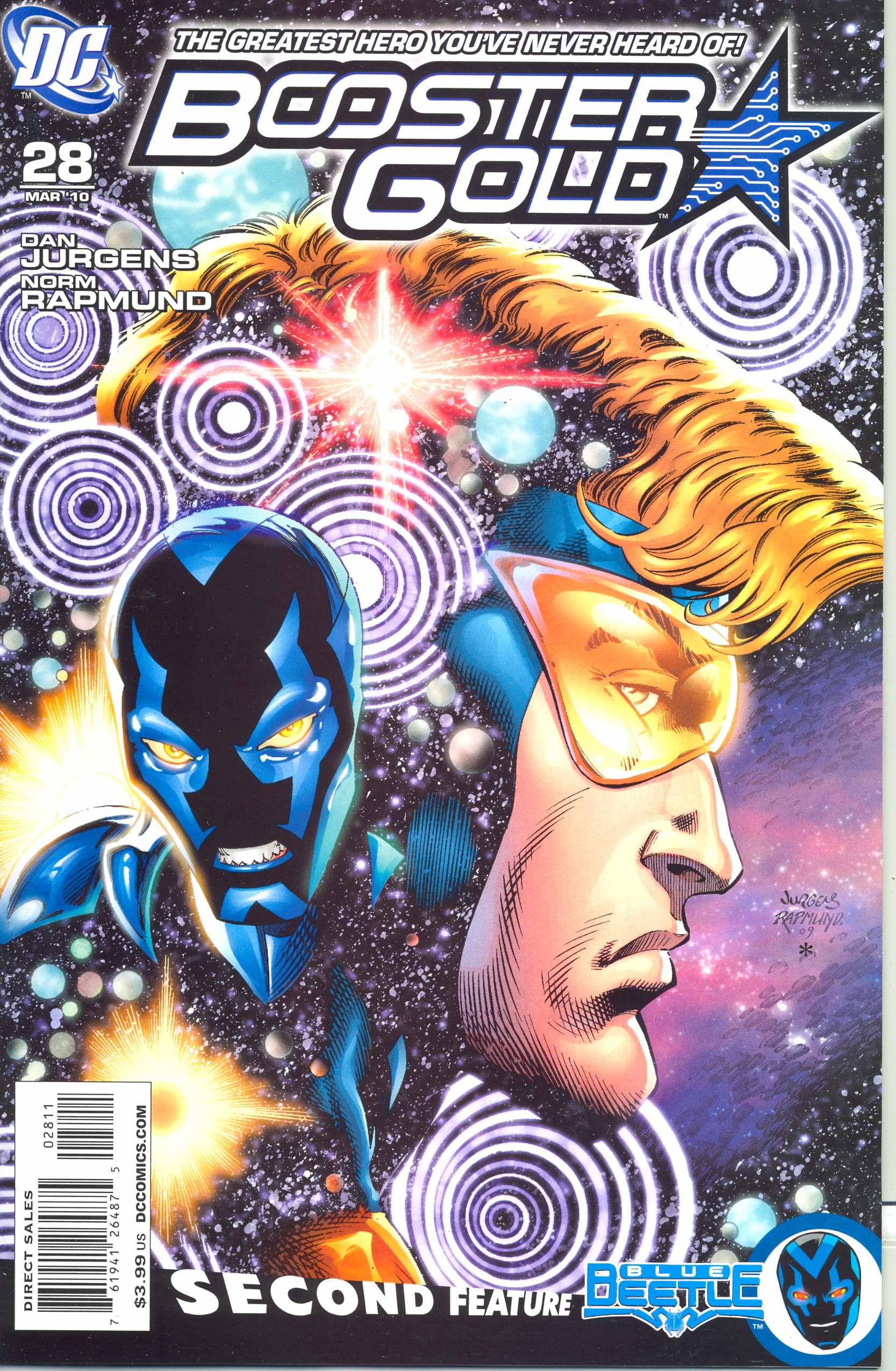 Written by Dan Jurgens; co-feature written by Matthew Sturges Art by Dan Jurgens & Norm Rapmund; co-feature art by Mike Norton & Norm Rapmund Cover by Dan Jurgens & Norm Rapmund After the shocking events of BLACKEST NIGHT, Booster Gold finds himself lost in time! And in the co-feature, Jaime Reyes at last comes to terms with the scarab's murderous side - and Blue Beetle will never be the same! On sale January 13 o 40 pg, FC, $3.99 US