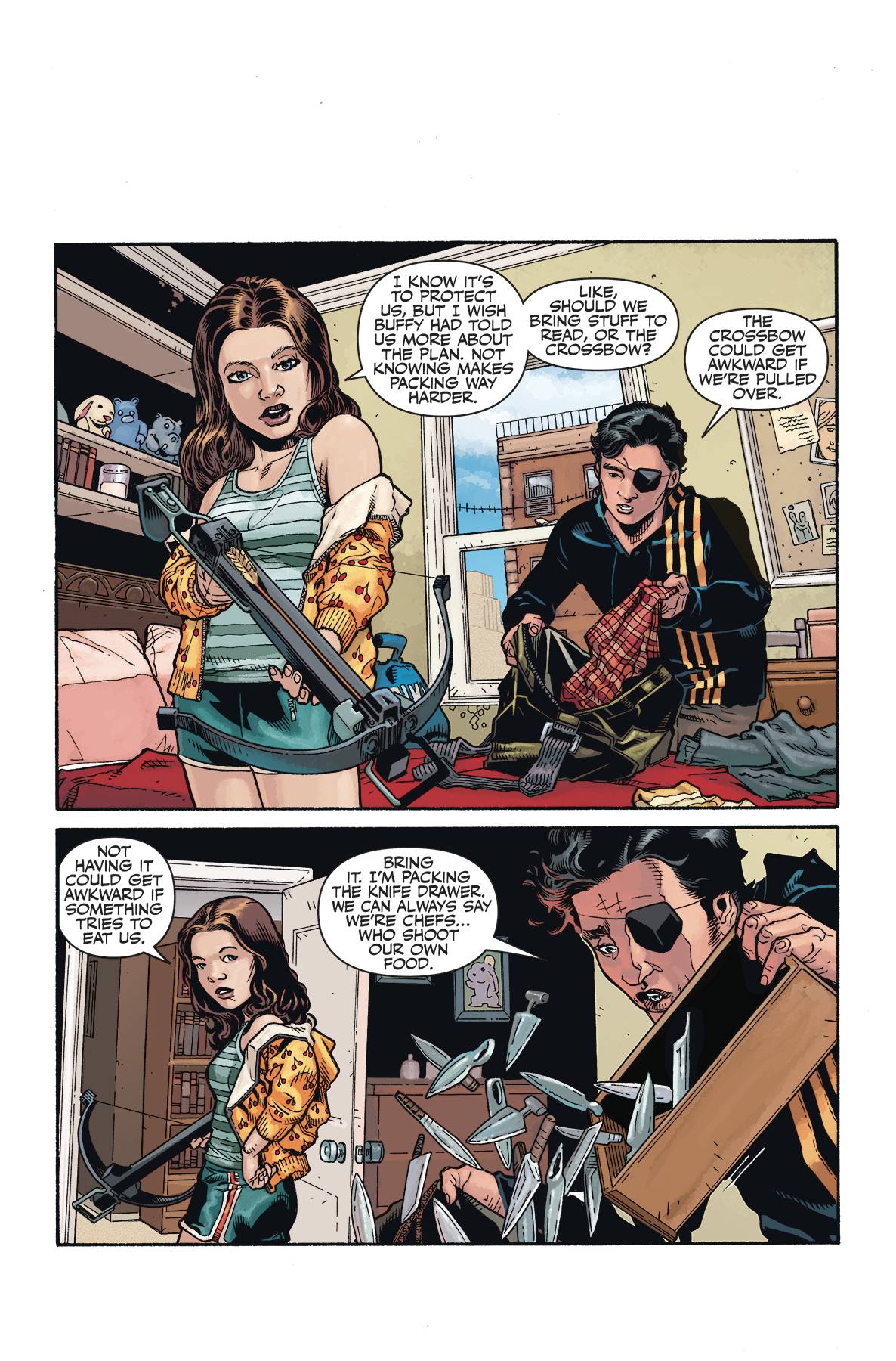 The great escape is underway as Buffy, Faith, and Willow infiltrate headquarters at the Safe Zone. Everything and everyone they expected to stop their mission is in the way. The question is, can two powerless girls and one Slayer succeed with these ridiculous odds? Elsewhere: unexpected vampire complications...