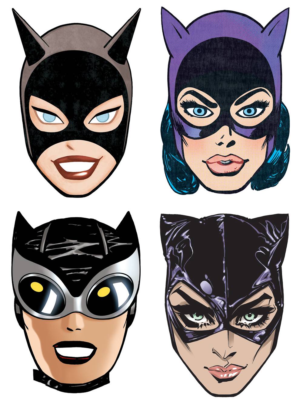 Quantities may be limited. Allocations may occur. Catwoman 80th Anniversary paper masks reinterpreted by Ryan Sook, featuring the work of these superstar artists: Bruce Timm, Jim Aparo, Darwyn Cooke, and Joelle Jones. Set of 4 paper masks. Ships same day as the Catwoman 80th Anniversary 100-page Super Spectacular #1.