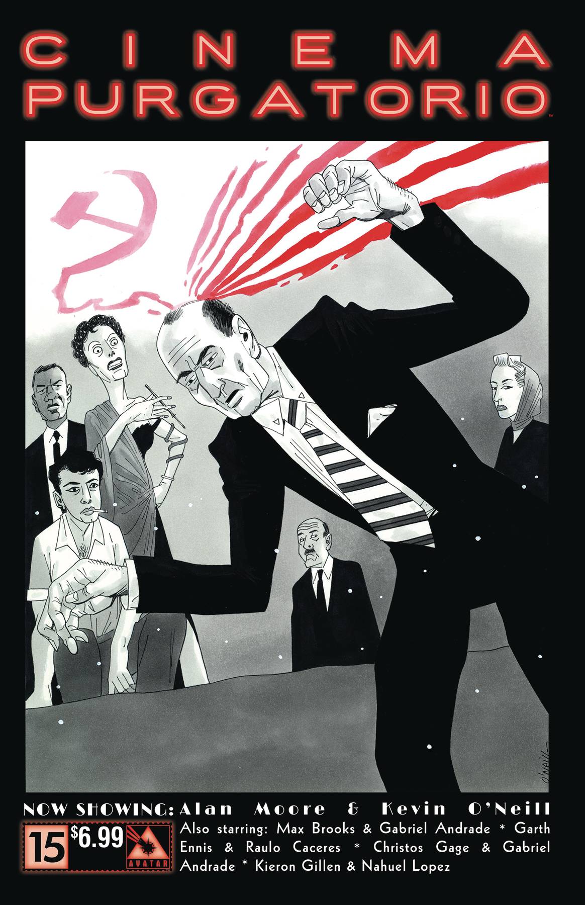 Join a master class of sequential artisans as they spin stories to terrify and delight in the finest anthology in comics. Now showing: Cinema Purgatorio by Alan Moore and Kevin O'Neill, A More Perfect Union by Max Brooks and Gabriel Andrade, Code Pru by Garth Ennis and Raulo Caceres, Modded by Kieron Gillen and Nahuel Lopez, and The Vast by Christos Gage and Gabriel Andrade. Each story has its own cover by the series artist.