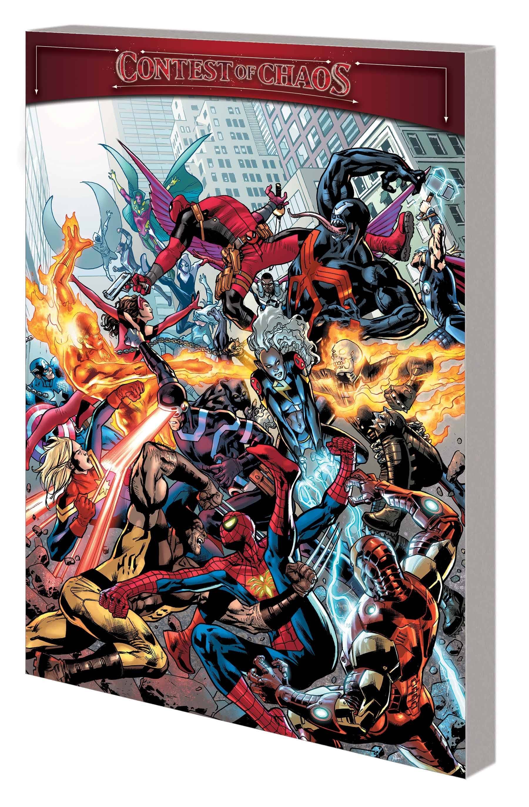 Agatha Harkness wants a new Darkhold, and she's using Earth's heroes to get it! The Contest of Chaos is on as Spider-Man passes through a portal to a remote, magical city - where Wolverine attacks! Things really heat up when the Human Torch faces off against Ghost Rider, and the atmosphere is electric when Iron Man battles Storm! The hits keep on coming: Moon Knight takes on the powerhouse Taegukgi! Ghost-Spider clashes with White Fox! Captain Marvel confronts Cyclops! And in the ultimate fan-favorite anti-hero showdown, it's Deadpool vs.Venom! But, as more of Agatha's plan is revealed, can even Scarlet Witch and the Avengers put a stop to it? Collecting SCARLET WITCH ANNUAL #1, SPIDER-MAN ANNUAL (2023) #1, IRON MAN ANNUAL (2023) #1, FANTASTIC FOUR ANNUAL (2023) #1, MOON KNIGHT ANNUAL (2023) #1, SPIDER-GWEN ANNUAL (2023) #1, VENOM ANNUAL (2023) #1, X-MEN ANNUAL (2023) #1 and AVENGERS ANNUAL (2023) #1. Rated T+