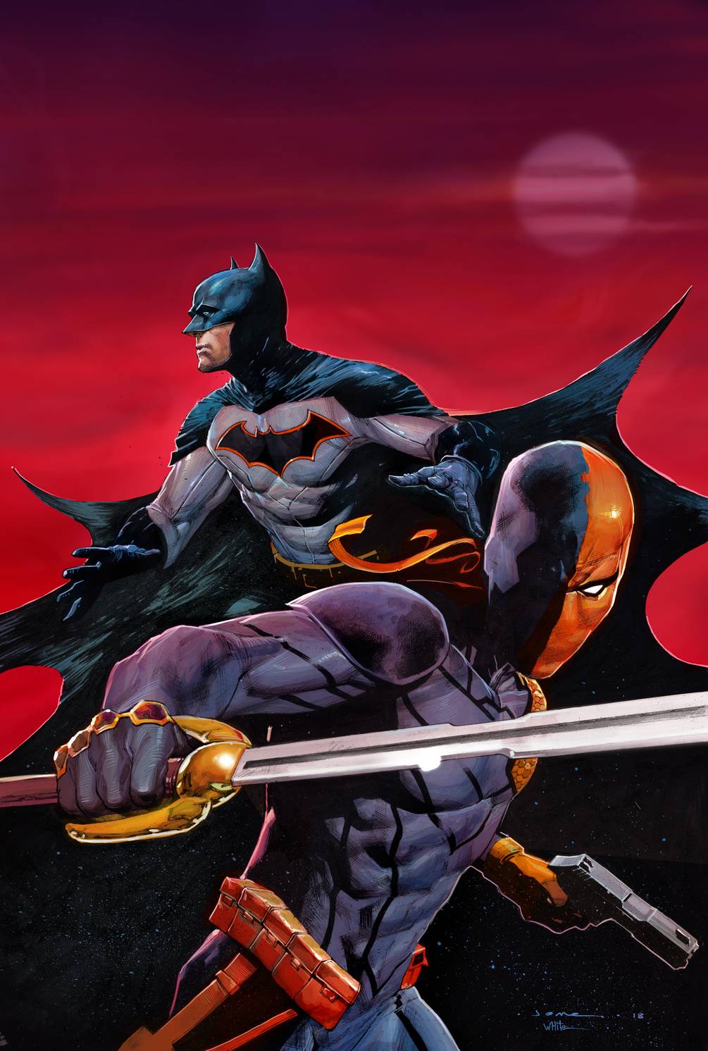 "DEATHSTROKE VS. BATMAN" part two! The war between Deathstroke and Batman escalates when the Dark Knight foils one of Deathstroke's assassination attempts! Meanwhile, a mysterious package brings Commissioner Gordon to Bruce Wayne's doorstep, and Adeline Kane - Slade Wilson's ex - sets her sights on Batman!
