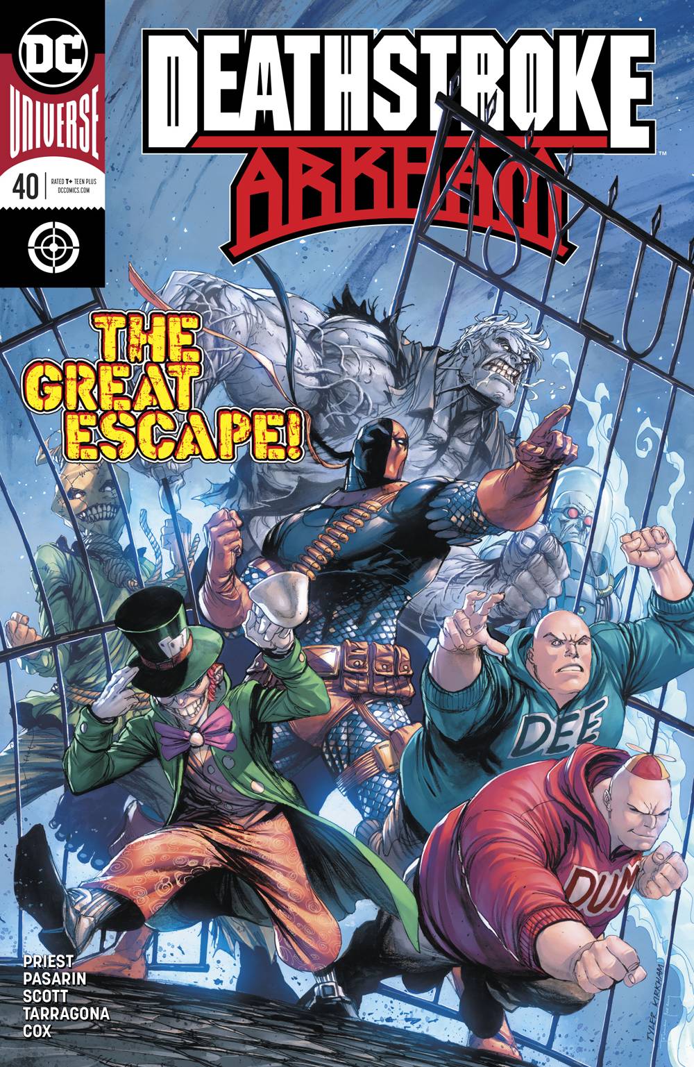 Deathstroke's son Jericho breaks into Arkham Asylum in an effort to free him, but Slade Wilson is caught up in his own conflict with the return of Dev-a.k.a. "Death Masque"-and the realization that his hallucinatory trip into outer space may have been more real than previously advertised! Meanwhile, Two-Face has Rose dead to rights-is there anyone left to save her? RATED T+