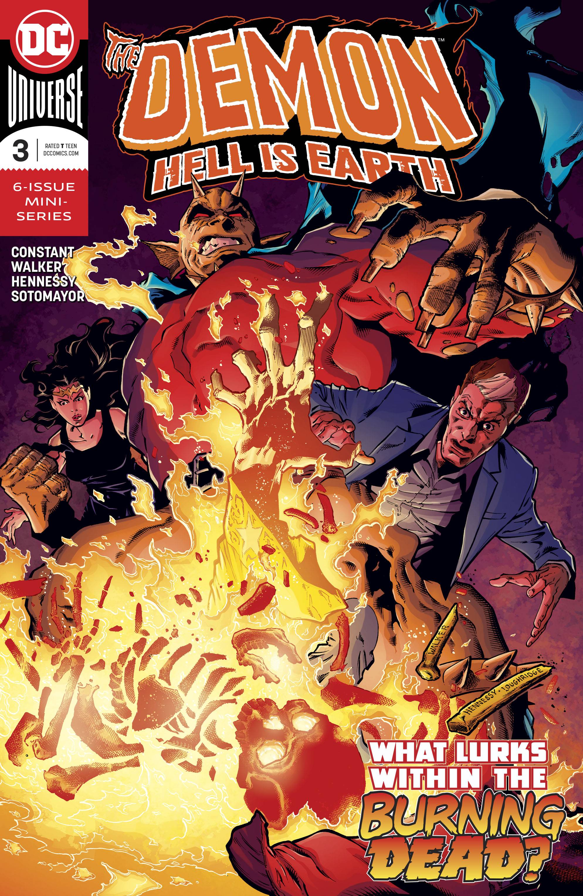 After the horrific acts of last issue, the highly unstable team of Etrigan, Jason Blood and Xanadu must face a new threat. A new player that has been ally, enemy and family to Jason and Etrigan reveals itself, and explains just who is responsible for the nightmarish transformation facing Earth. But before the shock of this information can be absorbed, the group must face a different family member. And he's got an offer that Etrigan can't refuse. Alliances will be made, familial bonds will be broken, and blood will be spilled! RATED T
