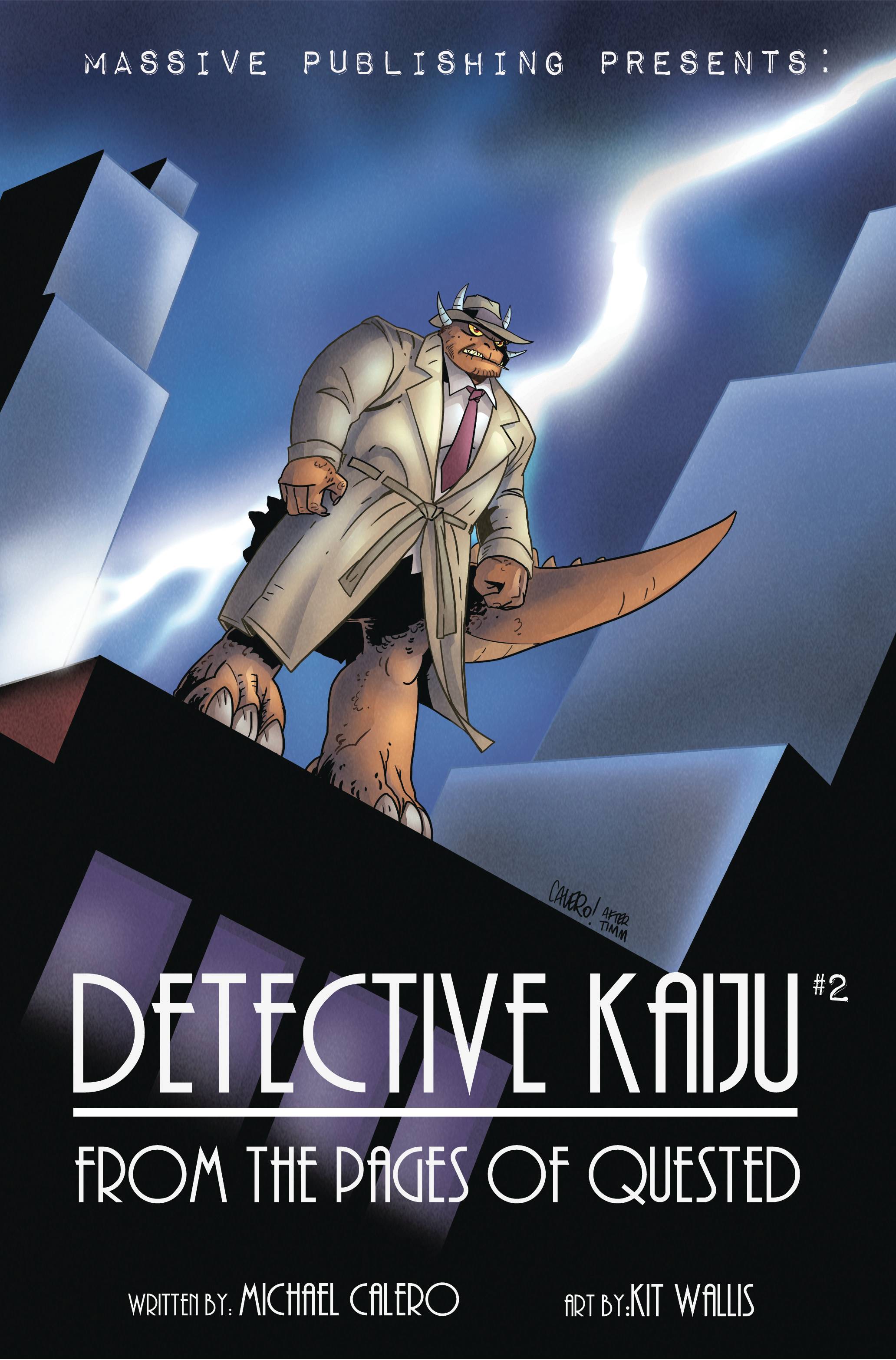 Series author, Michael Calero, provides this Noir homage cover for issue #2 of Detective Kaiju. From the pages of the fan-favorite series "Quested" comes a noir comic of epic proportion! Detective Kaiju the hardboiled investigator gets his own mini-series with Quested's Michael Calero (American Psycho) and Kit Wallis (High On Life) reuniting on the 3 part murder mystery. In the second issue, the investigation heats up as Detective Kaiju gets closer to unraveling the mystery. All while battling the demons of his past.