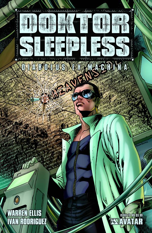 by Writer: Warren Ellis Art: Ivan Rodriguez Readership: MR Format: Full Color, 32 pages, bi-monthly UPC - 820023002962 13011 PRODUCT DESCRIPTION: People are hunting Doktor Sleepless. There's a journalist on the streets trying to unpick his skein of lies and half-truths. There's a killer on the streets who wants to save the world from him. There's an old colleague with a gun who wants to ask him some questions. There's Grinders waiting for him to tell them what to do, there are people wondering why their city seems to be falling apart around them and looking for someone to blame... and no-one's seen Doktor Sleepless in weeks. Police Commissioner Preston Stoker, watching his city burn, has to wonder -- what is the mad scientist out to destroy everything planning now? Warren Ellis' on-going satirical-political science fiction novel continues its decent into madness. The issue is available with a regular cover by series artist Ivan Rodriguez, or wraparound cover by Raulo Caceres, and also a Future Warning Sign cover. (resolicited from January 09)onder - what is the mad scientist out to destroy everything planning now? Warren Ellis' on-going satirical-political science fiction novel continues its decent into madness. The issue is available with a Regular cover by series artist Ivan Rodriguez, or Wraparound cover by Raulo Caceres, and also a rare Future Warning Sign cover.