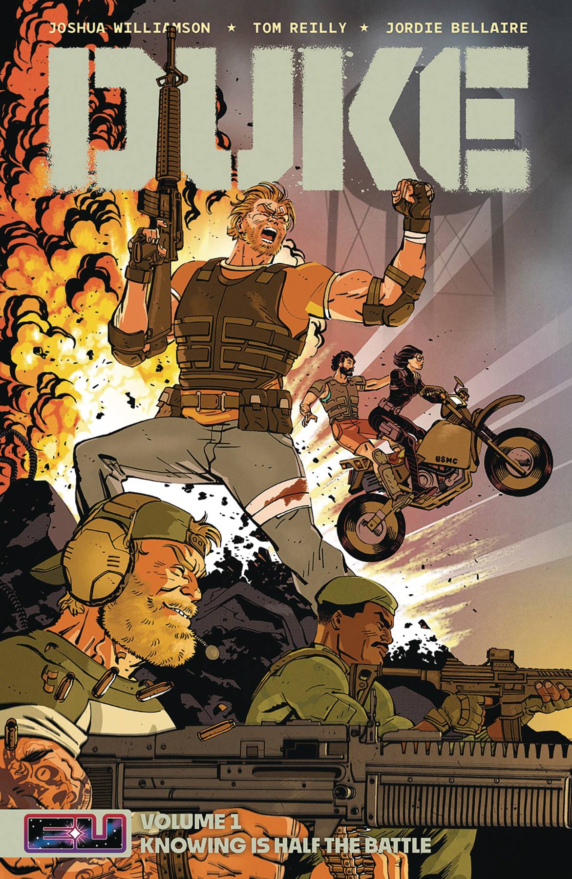Codename: G.I. Joe Begins Here! Conrad Hauser made first contact with an alien being and lived to tell the tale. But no one, not even Colonel Hawk, will believe the story of the colossal transforming robot that nearly killed the man known as Duke. Now, one of the US Army's most decorated officers is on the hunt for answers, drawn into a conflict that no amount of training could ever prepare him for. A war that only a real American hero has any chance of surviving... Writer Joshua Williamson and artist Tom Reilly kick off the first of four action-packed miniseries that will introduce the best and worst humanity has to offer in the Energon Universe. Featuring a Direct Market Exclusive cover by Tom Reilly that will only be printed once. Collects Duke #1-5.