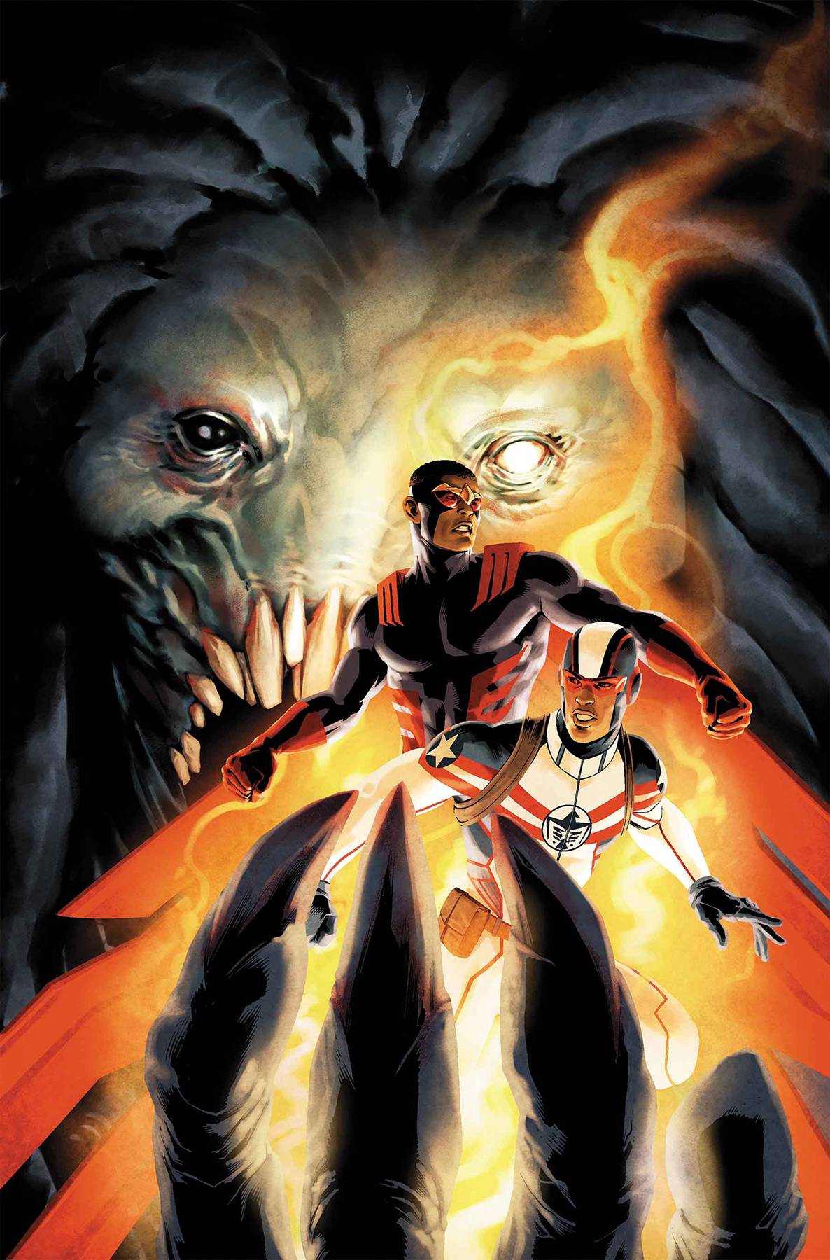 TAKE FLIGHT Part 2 • The Falcon and the Patriot fight to restore order as a full-scale riot threatens to destroy the city of Chicago! • But little do they know, the rage behind the burgeoning brawl is being brought about by the demon prince and son of Mephisto - Blackheart! • Can Sam and Shaun find a way to even the odds? Or will they be swallowed whole by forces from beyond this world? Rated T+