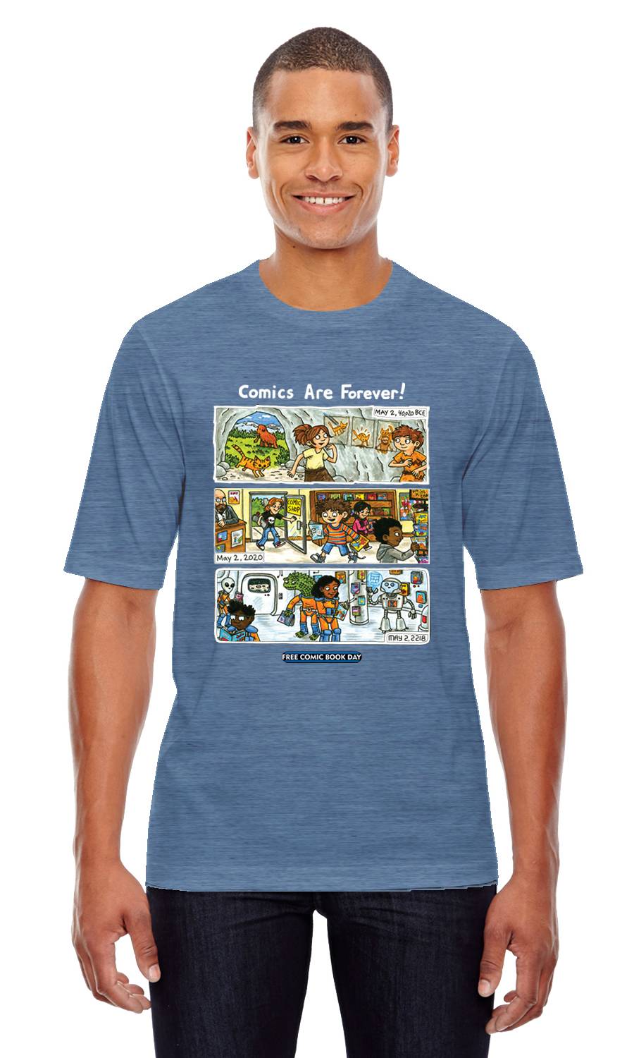 Graphic narratives have always been part of human history, from ancient cave paintings and Egyptian hieroglyphics to today's comic books and graphic novels to tomorrow's technologies we can't yet imagine. Jeffrey Brown, the beloved writer/artist of Star Wars: Darth Vader and Son, his original illustrated book series Lucy & Andy Neanderthal, and his autobiographical work, reminds us that "Comics Are Forever" with 2019's Free Comic Book Day Commemorative Artist T-Shirt and Poster in an original art piece that features Neanderthal children Lucy and Andy and celebrates Free Comic Book Day, past, present, and future!