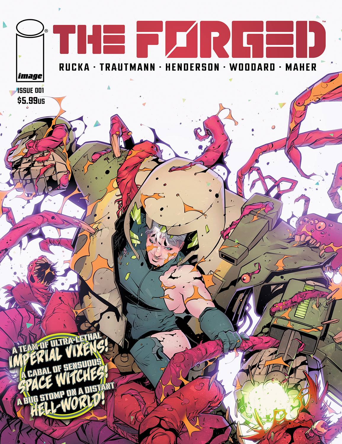 In the 11th Millennium of the rule of the Eternal Empress, a squad of planet-smashing super soldiers find their routine mission to be anything but. These are the Forged. They take no prisoners. Written by GREG RUCKA & ERIC TRAUTMANN and brought to the page by MIKE HENDERSON, embark upon an over-the-top pulp adventure of sex, violence, and sci-fi inspired by Conan, Heavy Metal, and other comics you tried to hide from your parents.