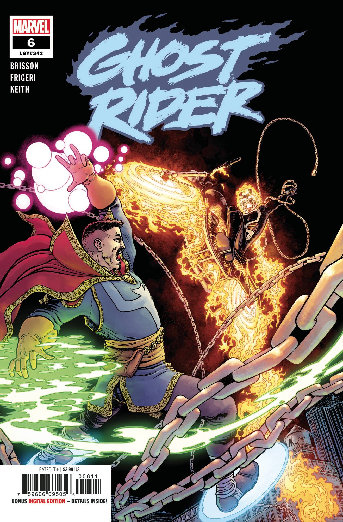 VERSUS THE SORCEROR SUPREME! As far as Johnny Blaze is concerned, there's one man who had the power to pull him outta Hell, but that man chose not to lift so much as a finger for him, and that man's name is Doctor Stephen Strange! So now Johnny's got a can of whupass with ol' Stevie's name on it! Rated T+