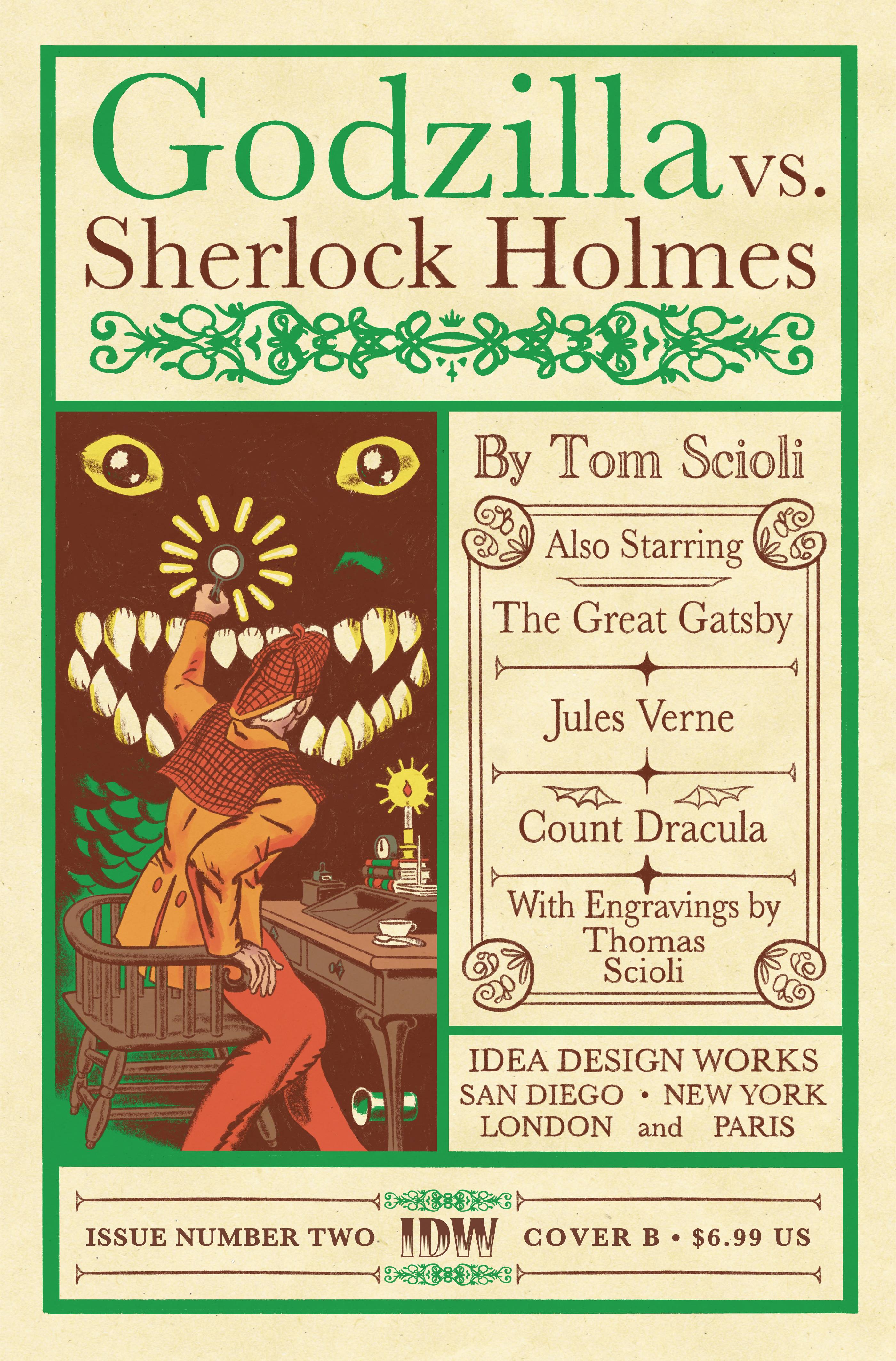The roar of the twenties escalated to a mighty SKREONK as Godzilla attacked the party of the wrong man and hurt the wrong lady. Now Jay Gatsby has enlisted the help of SHERLOCK HOLMES, THOMAS EDISON, JULES VERNE, THE TIME MACHINIST, and more to put an end to the Godzilla threat once and for all. Watch as our new team travels twenty thousand leagues under the sea and turns Paris into the ultimate Godzilla trap in this thrilling feat of cartooning by the unrivaled Tom Scioli.