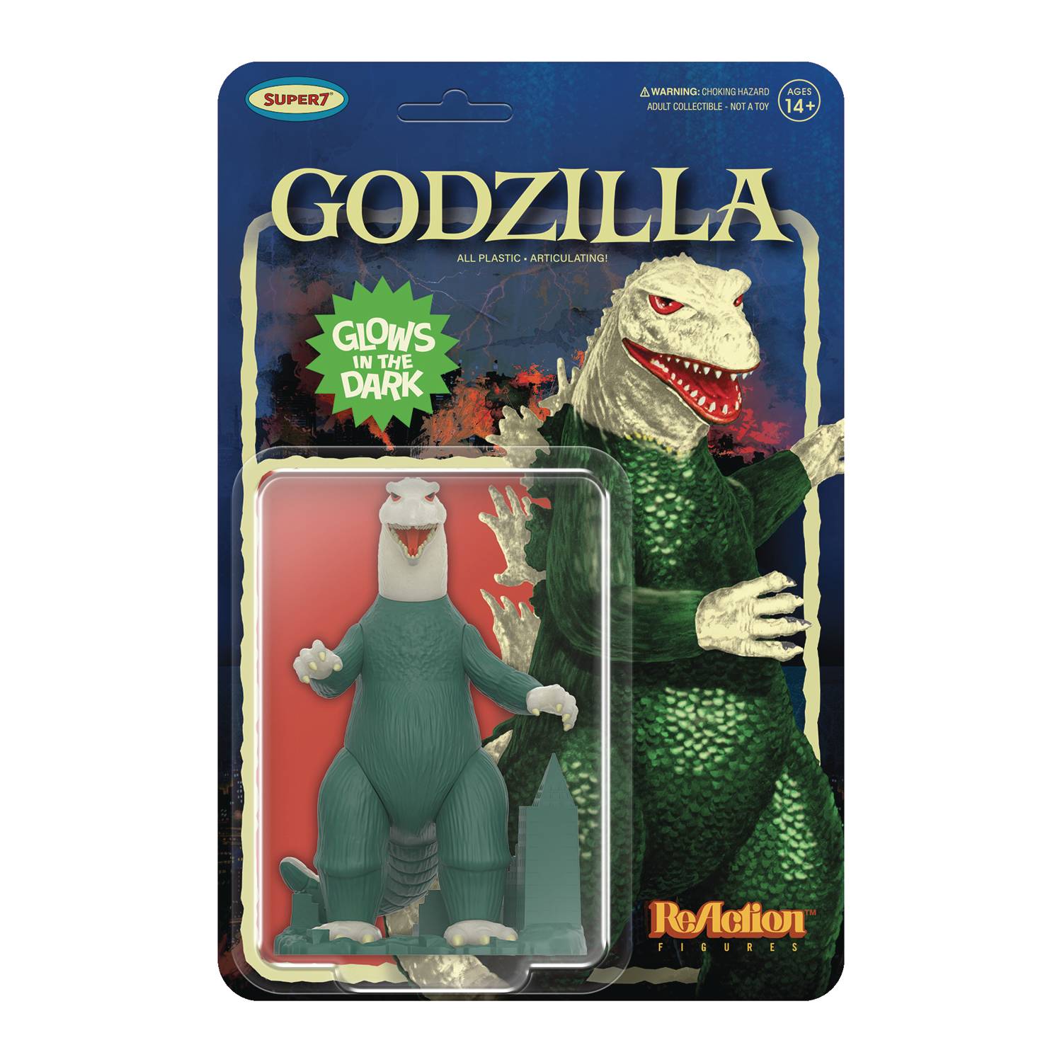 From Super7. Imagine this: Godzilla, in all its destructive glory, glowing in the dark-right in the palm of your hand. This 3.75" scale, articulated Godzilla ReAction Figure, inspired by the Canadian variant of the original 1960s model kit under the Toho license, brings the King of the Monsters to life like never before. With glowing details that will light up your shelves at night, this figure embodies all the terrifying power of the original Godzilla, with a new, dramatic twist. Packed on a full color, blistered cardback, what makes this figure even more iconic is the included removable cityscape accessory, perfectly to scale and ready to be destroyed at Godzilla's monstrous feet. It's an epic scene waiting to unfold-add this mighty kaiju to your collection today!
