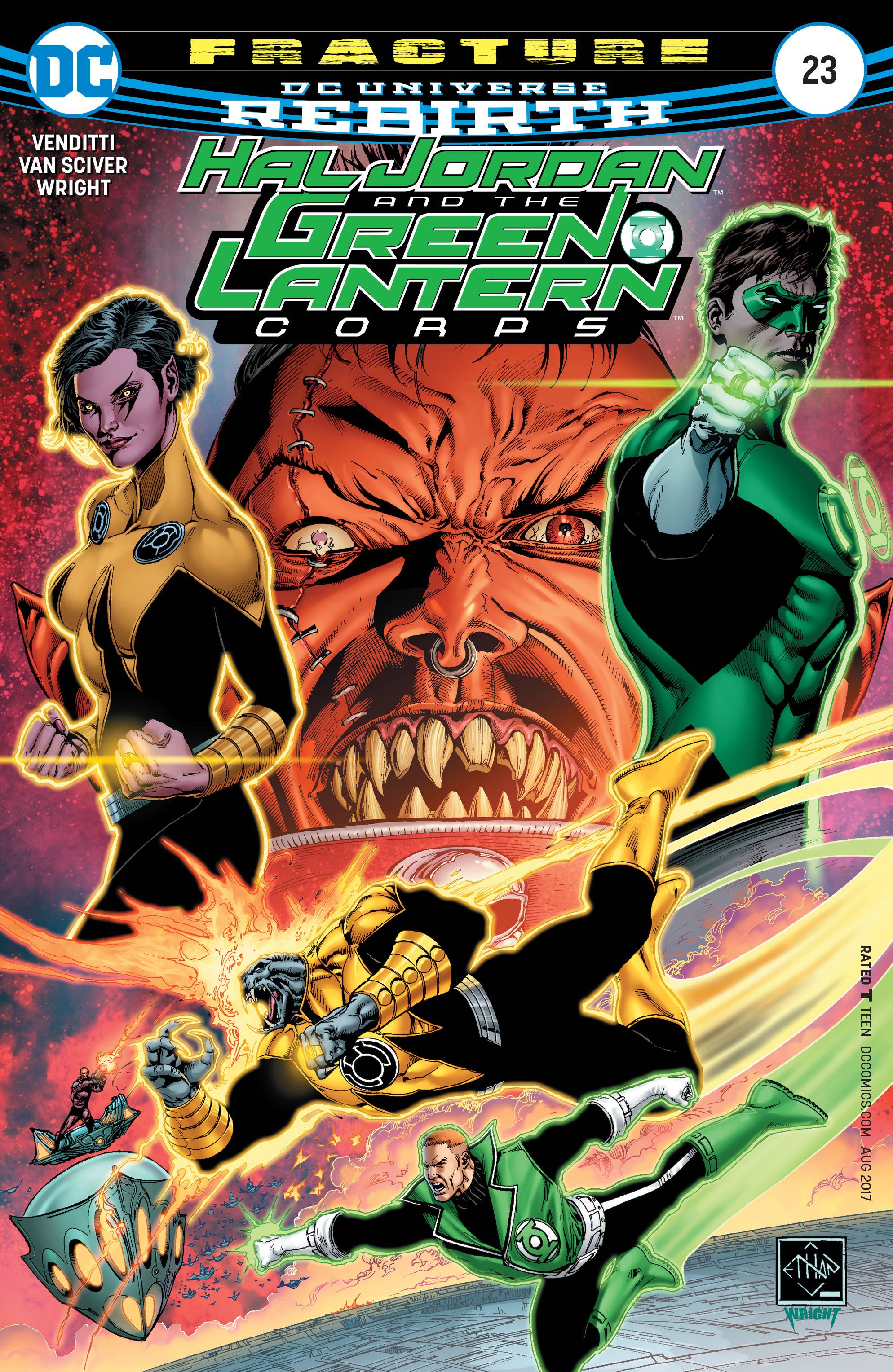"FRACTURE" part two! As a Green Lantern stands accused and Hal Jordan rushes to his defense against the Sinestro Corps, Guy Gardner and his new partner Arkillo embark on a mission that, if successful, could stop both sides from killing each other. RATED T