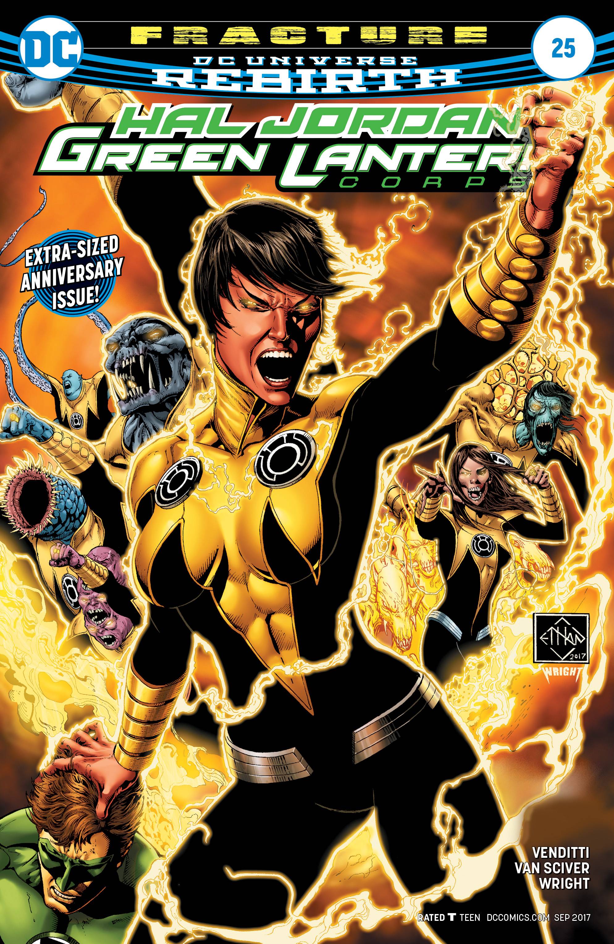 "FRACTURES" part four! In this extra-sized issue, it's Lantern vs. Lantern as the GLC and Sinestro Corps duke it out over the murder of Sinestro Corps members. And a Lantern turns his back on their friends, embracing the darkness.