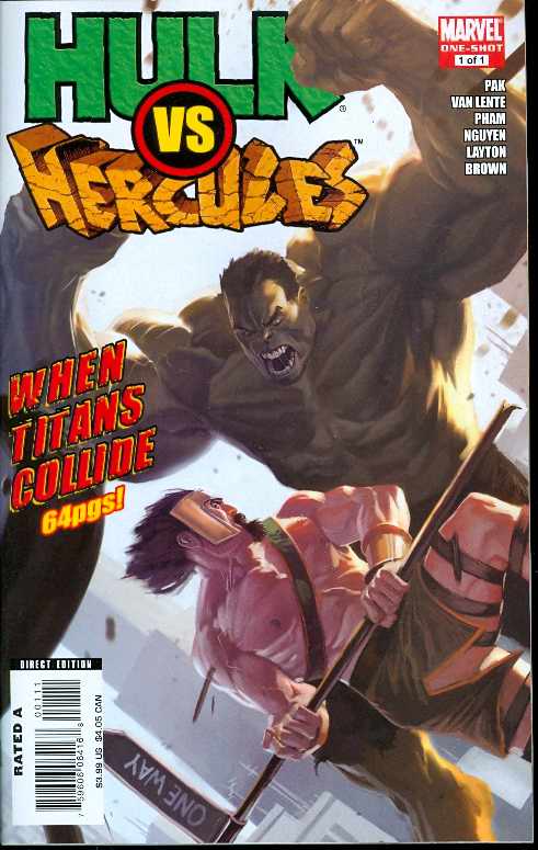 Written by GREG PAK & FRED VAN LENTE Art by LEONARD KIRK Cover by MARKO DJURDJEVIC "32 PAGES!? BAH! HULK NEED BIGGER BOOK! HULK SMASH PUNY BEARD SKIRT MAN!" Calm down, big fella. You're going to need your strength when you go up against the Lion of Olympus, the INCREDIBLE HERCULES! We're bringing you a BRAND NEW story with THE most SMASHING, CRASHING, BASHING, MASHING and LASHING you've EVER witnessed, and THEN we're giving you some of the greatest HULK and HERC stories from yesteryear! BRING ON THE FIGHT! 64 PGS./Parental Advisory ...$3.99 PRODUCT UPDATE (022708): Hulk vs. Herculus: When Titans Clash will now be entitled Hulk vs. Hercules: When Titans Collide. PRODUCT UPDATE (030508): Hulk vs. Herculus: When Titans Collide will be Rated T, and will not carry the solicited Parental Advisory. PRODUCT UPDATE (040908): Hulk vs. Herculus: When Titans Collide will have art by Khoi Pham, not Leonard Kirk.