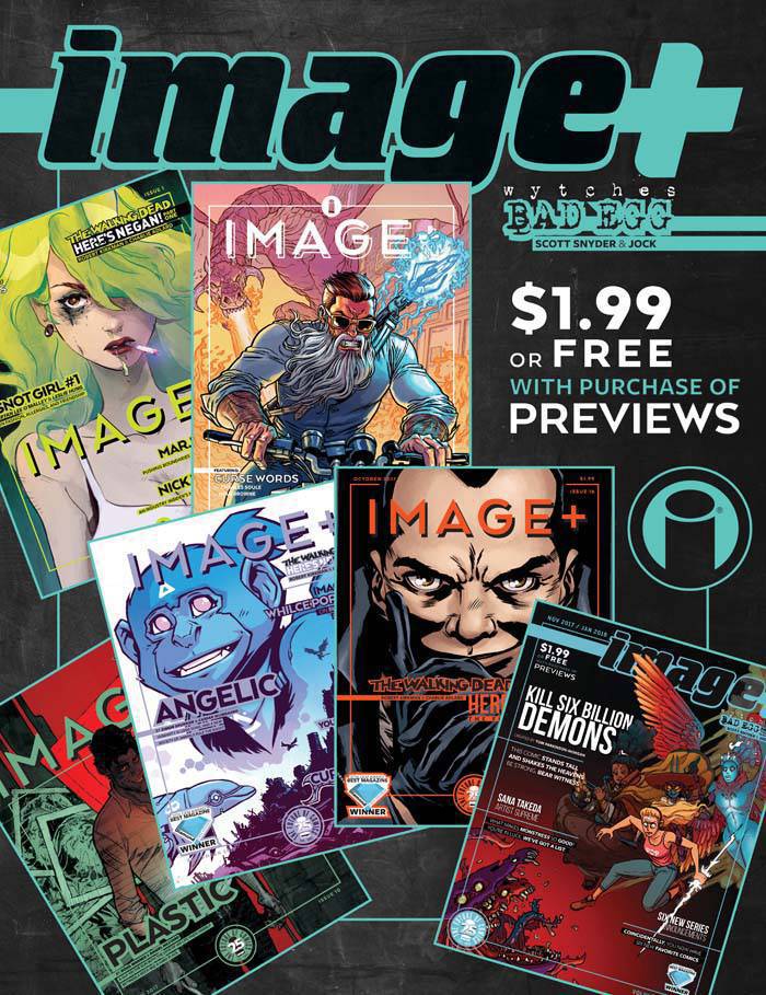 The latest issue of IMAGE+ magazine invites you to the vanguard of creator-owned comics, where sequential art's most passionate voices dive into their latest masterworks. Discover DEATH OR GLORY, RICK REMENDER (SEVEN TO ETERNITY, DEADLY CLASS) and BENGAL's new ongoing series about a vice-filled road trip through the backroads of America. JOSEPH KEATINGE (SHUTTER) prepares FLAVOR, a delicious mystery about a walled city where food is scarce and chefs fierce, illustrated with dreamy finesse by WOOK JIN CLARK. BRIAN K. VAUGHAN and MARCOS MARTÍN also reveal the secrets behind BARRIER, their harrowing sci-fi exploration of immigration. IMAGE+ overflows with exclusive interviews, art features, previews, and more, including another chapter of SCOTT SNYDER and JOCK's horror reinvention, WYTCHES: BAD EGG. IMAGE+ is free with any purchase of Diamond's Previews.