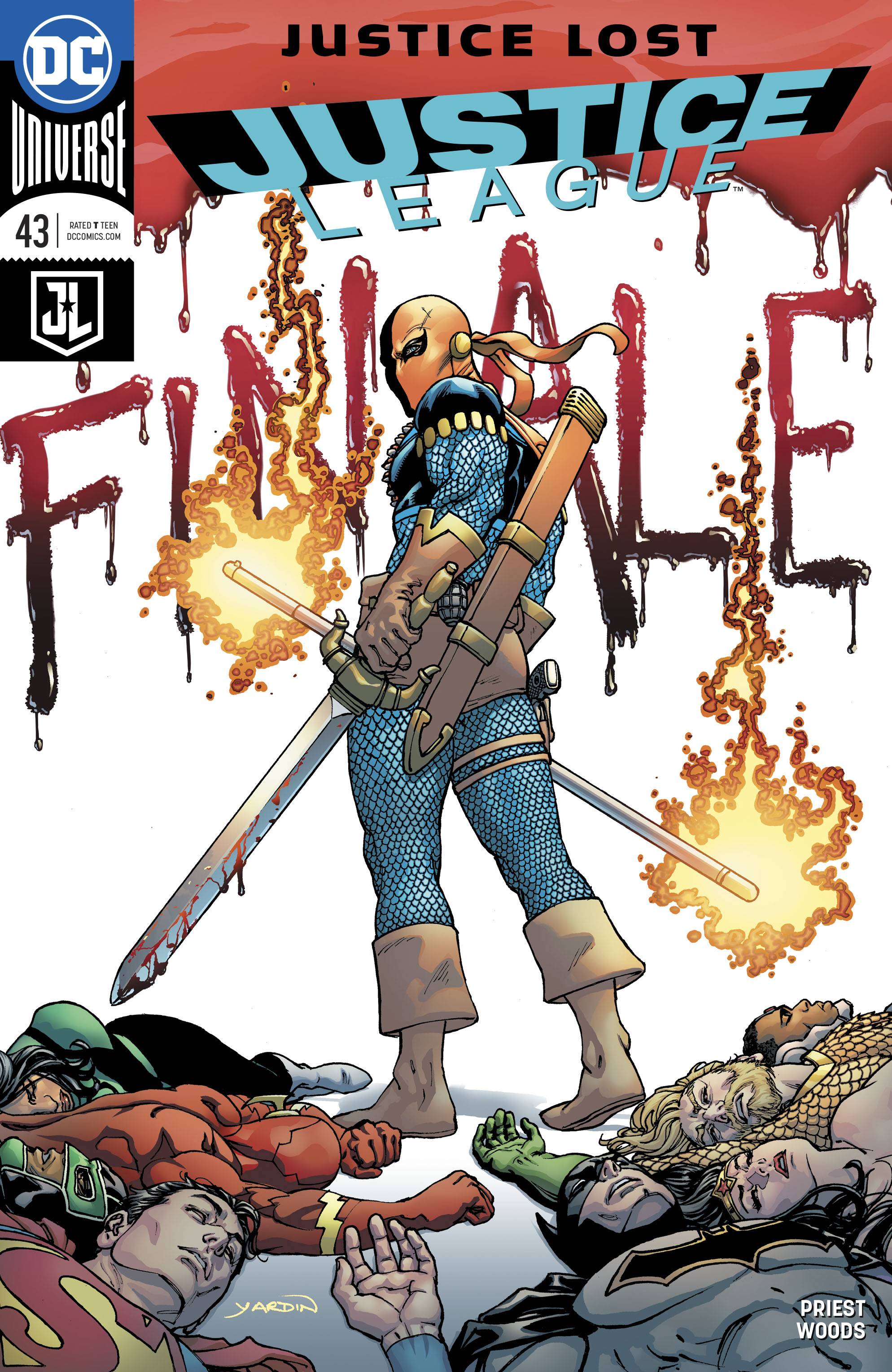 "JUSTICE LOST" finale! Struggling to save one of their own and extricate themselves from the grip of war, the Justice League's hand is forced by the mercenary Deathstroke! Decisions must be made about Red Lion's brutality, the insidious tactics of the Fan and the League's role as the World's Greatest Heroes. When the dust settles, will the old alliances still stand?