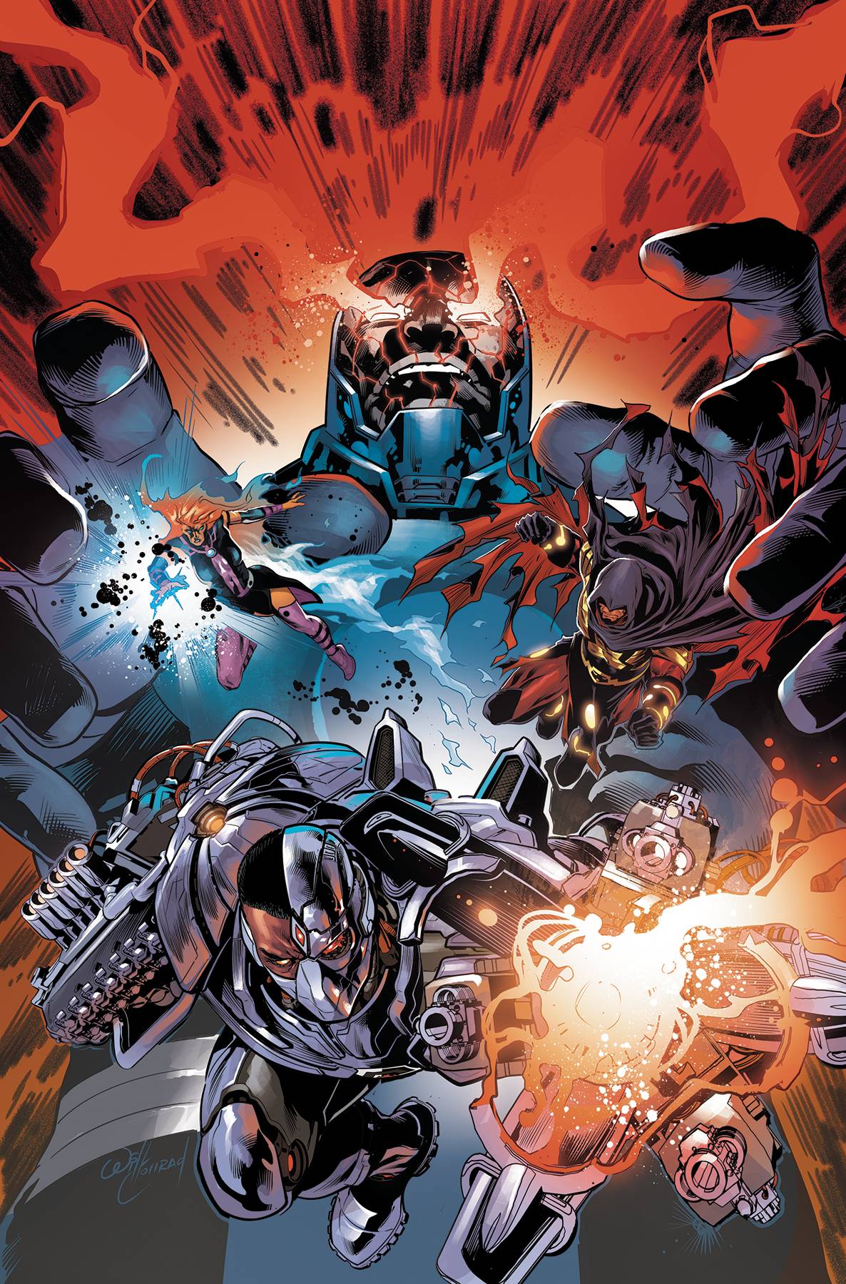 Sepulkore is activated! The entire Ghost Sector has been imprisoned and enslaved as a new realm of Apokolips, with Darkseid as its supreme ruler! Returned to power, with reborn New Gods at his side and the Ghost Sector as an implacable fortress, Darkseid sets his sights on the remaining universe! Can anyone stand in his way? Where are Justice League Odyssey? And what are the shocking identities of the heralds who now do Darkseid's malevolent bidding?