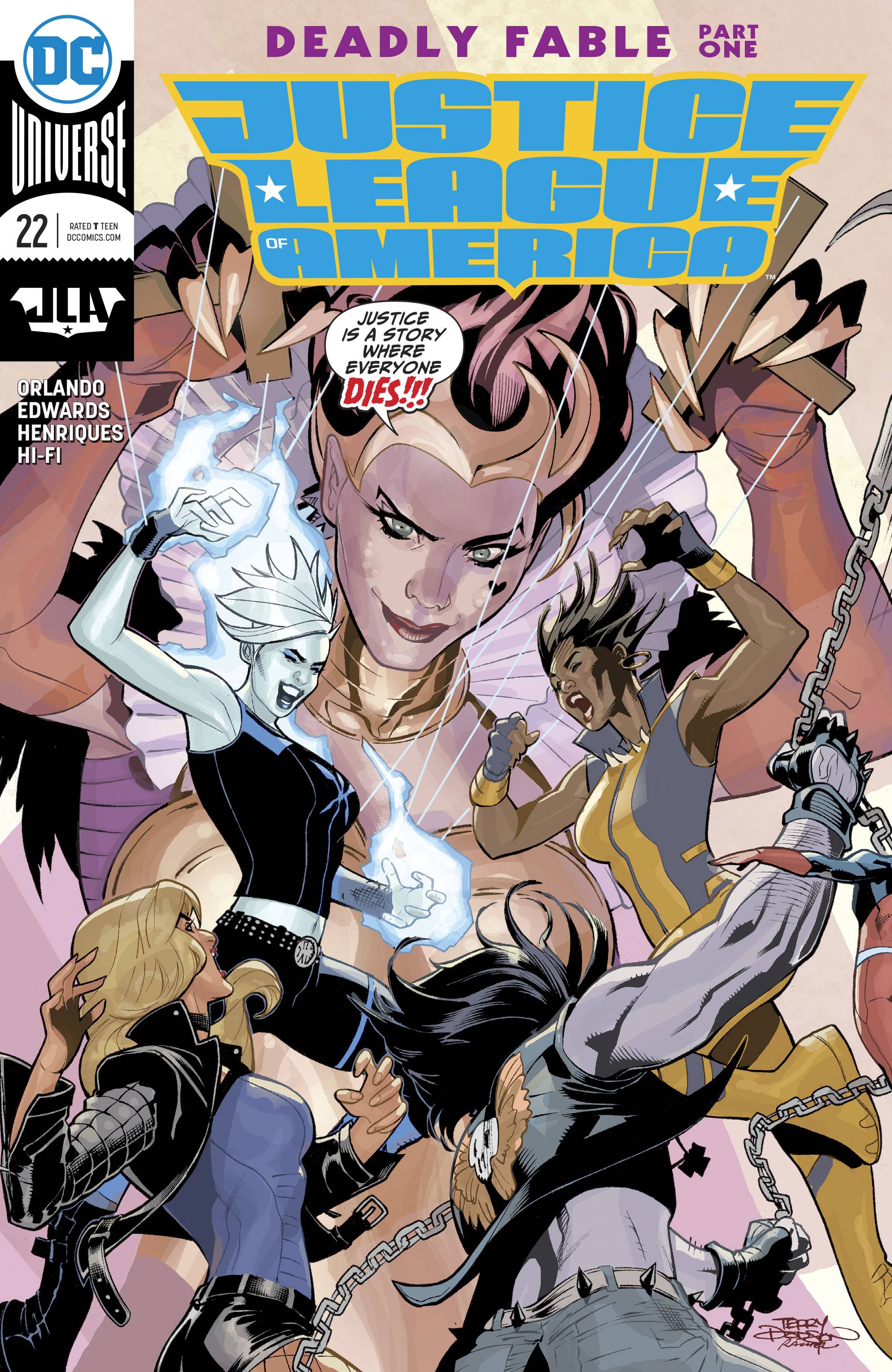 "QUEEN OF FABLES" part one! The Might Beyond the Mirror, the great threat that Batman assembled the Justice League of America to stop, has finally arrived in the form of the Queen of Fables. With her reality-warping power, her intent is to take over the real world and the imaginary and rule over everything-and without Batman, does the Justice League stand a chance against her? Or will reality crumble at the Queen's whim? RATED T