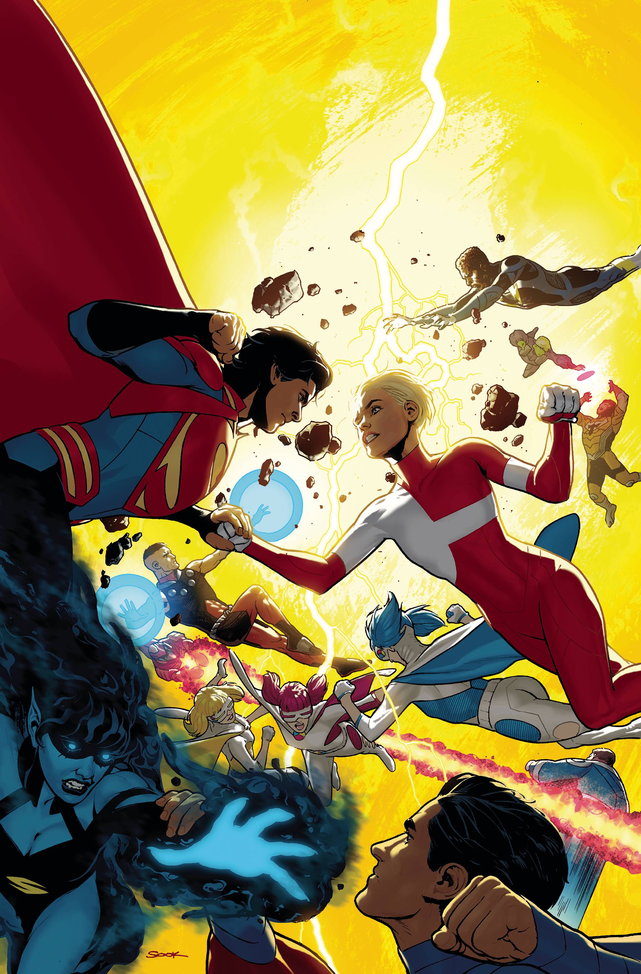 Brian Michael Bendis and Ryan Sook’s reinvention of the future’s greatest super-team continues! The United Planets is less than thrilled with the decision to bring Superboy a thousand years into the future to protect the past. Planet Gotham is under siege. Ultra Boy’s homeworld is on the verge of all-out war. And as if that weren’t enough, new Legionnaire drama unfolds as Saturn Girl and Cosmic Boy throw down over who should take on the Legion’s leadership! Plus, Brainiac 5 will reveal a secret that will make one Legionnaire quit the team—and we ask the burning question: Who is the strongest Legionnaire? And in an event fit for the 31st century, 41 of comics’ greatest artists join the series, with each page of the story starring a different Legionnaire! Plus, an enemy from the past surfaces in the far future, and romance blooms between Superboy and Saturn Girl! Collects Legion of Super-Heroes #7-12.