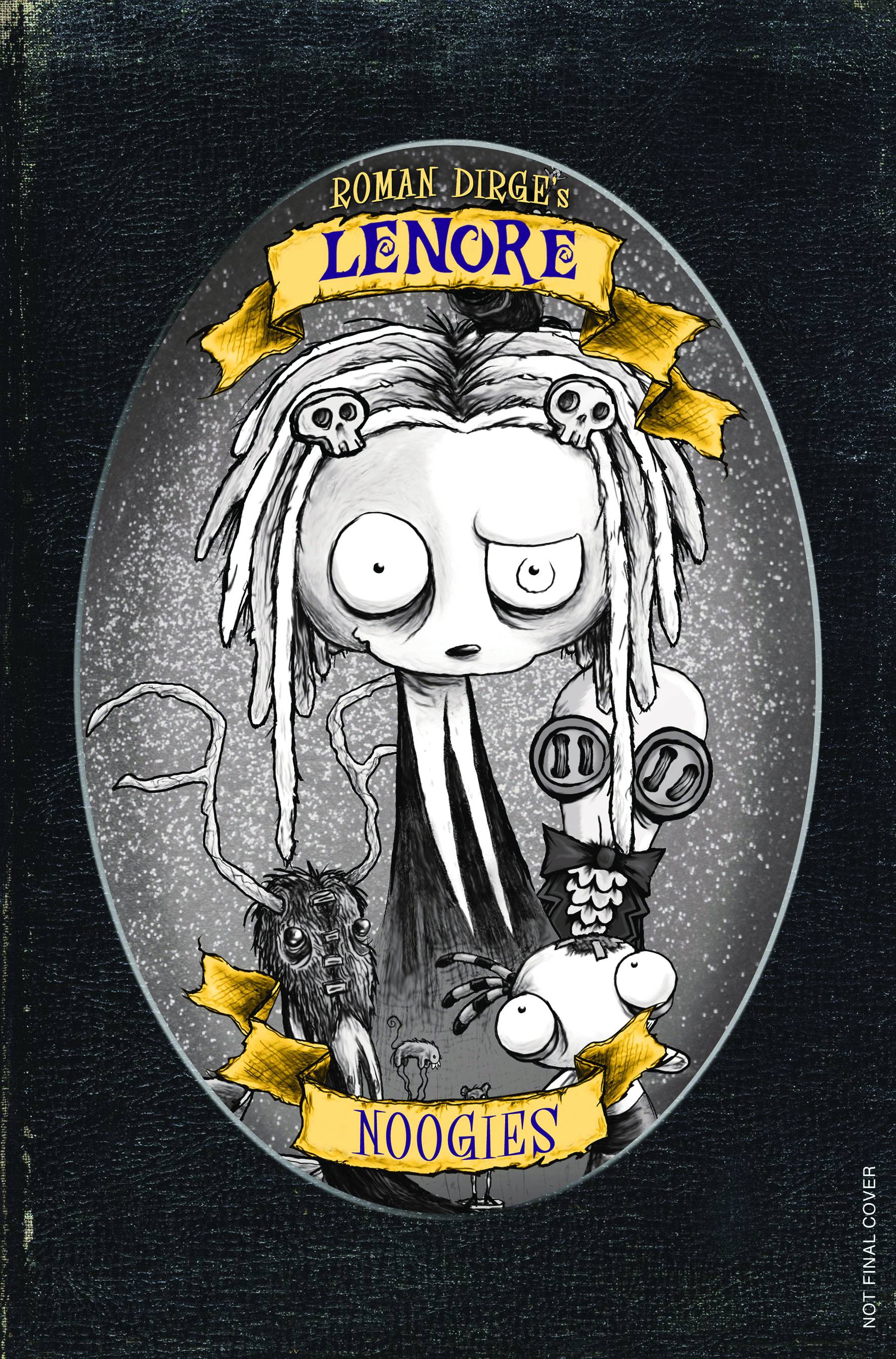 (W/A) Roman Dirge A PREVIEWS Exclusive! Lenore: Noogies collects the original Lenore comics in color for the first time, comics that went into multiple printings with over a million sold so far! Lenore might only be small, but her talent for mischief - and occasional wanton destruction - is anything but! Featuring stories about limbless cannibals, clock monsters, cursed vampire dolls, taxidermied friends, an obsessed would-be lover, and more fuzzy animal mutilations than should be legal, never has the term "something for everyone" seemed more sinister and bizarre! This fantastic exclusive hardcover will feature a superb new inset cover and exclusive extra material including a signature page from Roman Dirge and four frameable color art cards shrinkwrapped with the book!