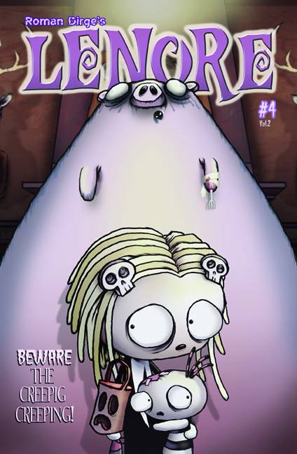 "Beware the Creepig Creeping, it gets you while you're sleeping!" Lenore eats a bacon-wrapped hot dog after midnight to find a pork chop telling her she has seven days left. After that, Creepig arrives to devour her whole!
