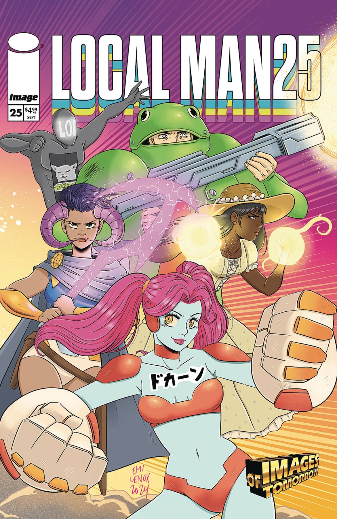 NEW STORY ARC IMAGES OF TOMORROW! Just as the Image Comics line did back in 1995, LOCAL MAN jumps ahead a full year to give you a glimpse of what the future brings, from issue 13...to 25!Third Gen is back with a vengeance! Their first mission? Bring down the reckless young superheroes of Fourth Gen! But will Local Man side with the Zoomers? Or will he help take them down in exchange for getting back the shield and uniform of...CROSSJACK?!The past, present, and future of the Image Universe collide hard in LOCAL MAN #25! On the flip! A corporate retreat at Third Gen HQ leads to...beach volleyball?