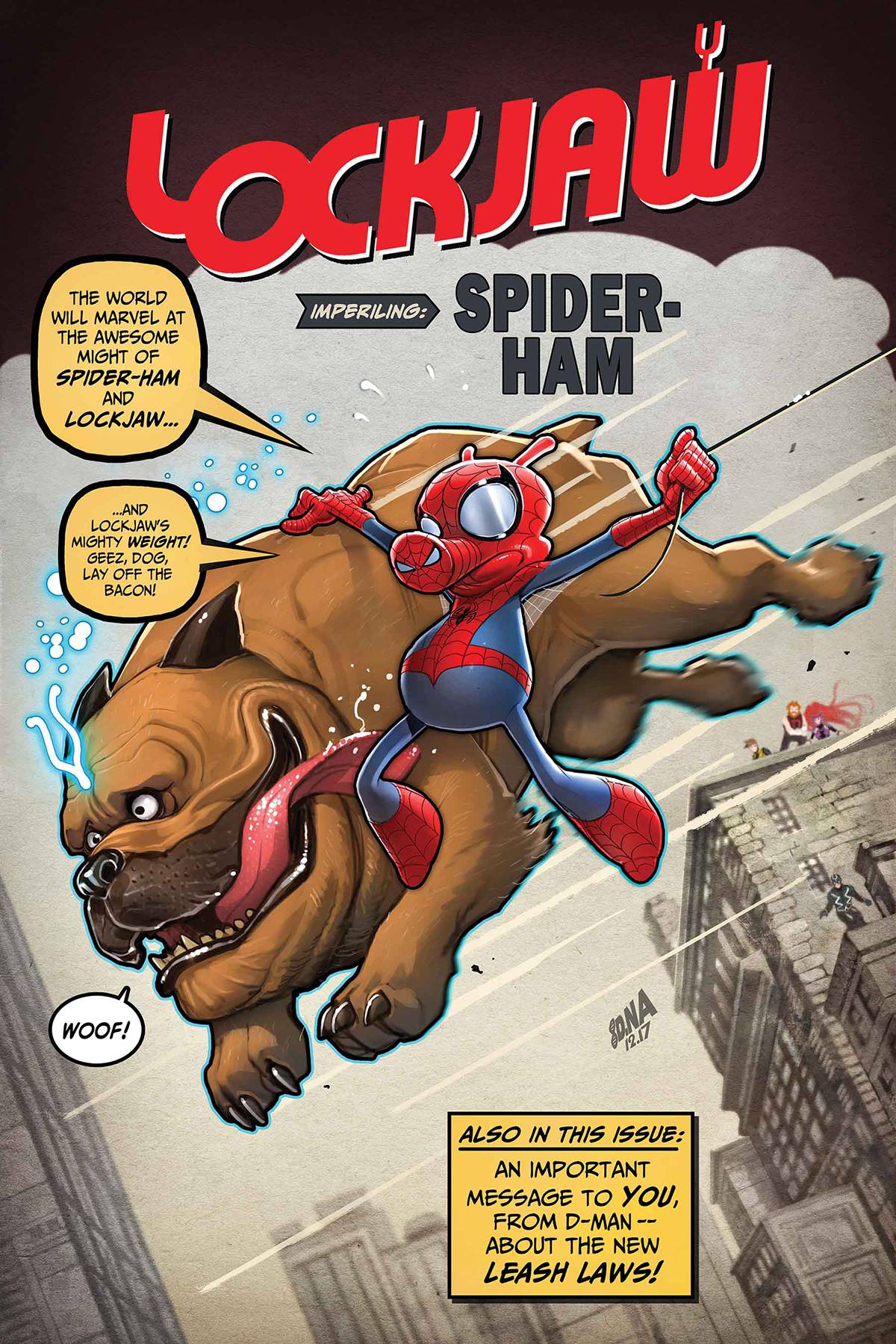 WHO'S A GOOD BOY? Part 3 A SPIDER'S PURPOSE! • Just when you thought the journey couldn't get any weirder, along came Spider-Ham! • Peter Porker needs Lockjaw and D-Man's help. A terrible danger is building - and it's all wrapped up in Lockjaw's scattered siblings! • Will Lockjaw find his last brothers and sisters? Can he save the Multiverse with Porker and friends? Will D-Man finally find out what the heck is going on? Find out here! Rated T