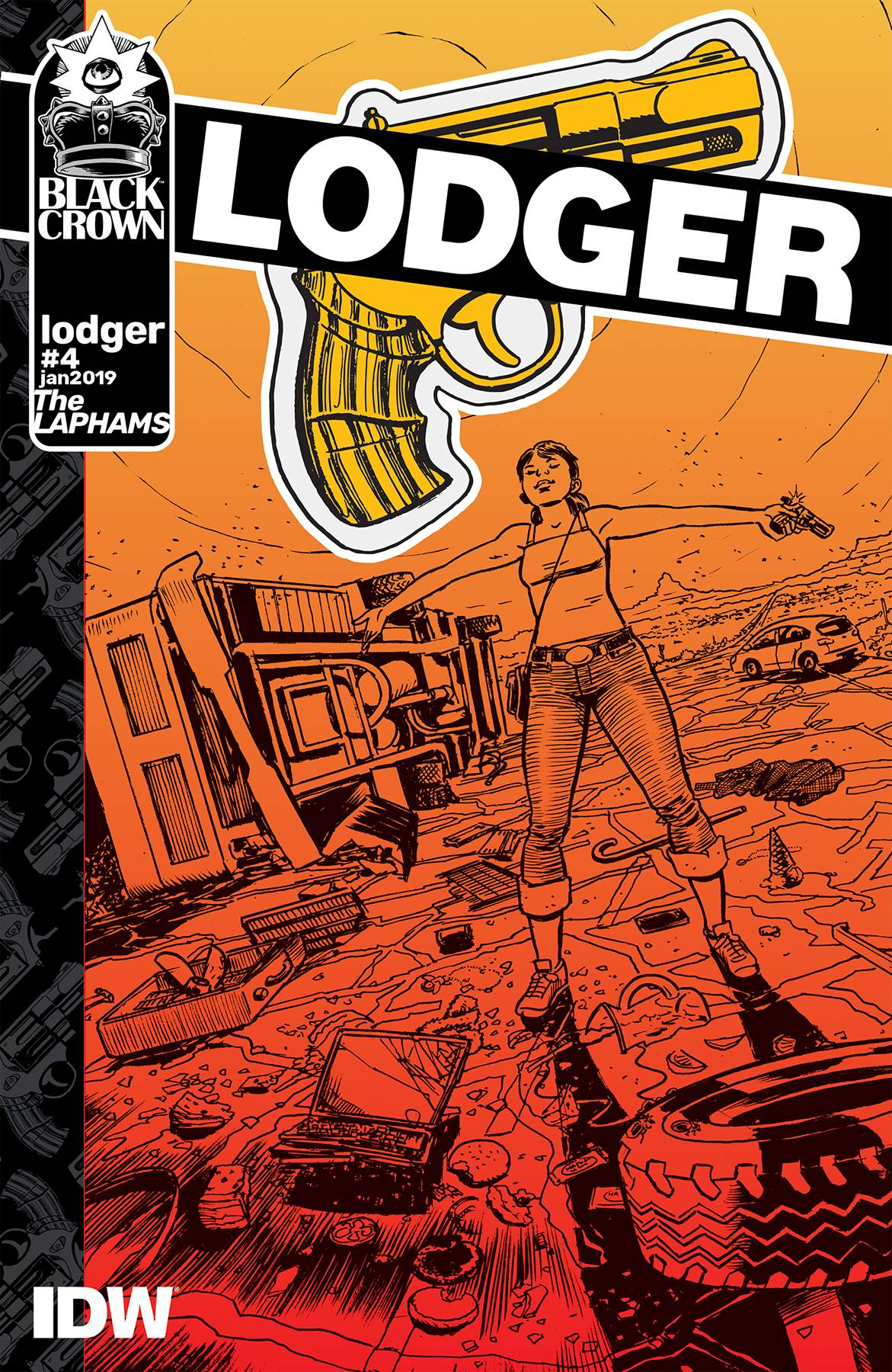The line between hunter and hunted gets blurred when the Lodger gives into temptation. And out on the open road, Ricky and Golddigger close in for the kill. The first black & white book from Black Crown! A new story from comics legends David & Maria Lapham (Stray Bullets)! Letters column, behind-the-panels process pages, & more! "LODGER is from the team that brought us Stray Bullets, so you know we're in safe hands, hands that just need one more rinse under a faucet to get the blood off them. This is small-town noir at its gothic best. Bleed on..."-Ian Rankin, best-selling author of Inspector Rebus