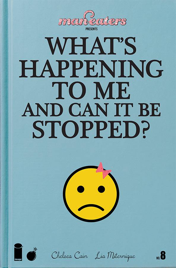 "MAN-EATERS PRESENTS: WHAT'S HAPPENING TO ME AND CAN IT BE STOPPED?" This mock guide to female puberty features personal stories, advice, illustrated charts, inspirational tips, and other topics of interest to teen girls-on-the-go who like witchcraft and advanced calculus.