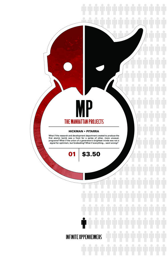 "INFINITE OPPENHEIMERS" What if the research and development department created to produce the first atomic bomb was a front for a series of other, more unusual, programs? What if the union of a generation's brightest minds was not a signal for optimism, but foreboding? What if everything... went wrong? Welcome to THE MANHATTAN PROJECTS, a brand new, ongoing, monthly comic from the creators of THE RED WING. Brought to you by award-winning writer JONATHAN HICKMAN and possibly the best new talent of the year, NICK PITARRA, THE MANHATTAN PROJECTS is a look at history through a darker, much stranger, lens.