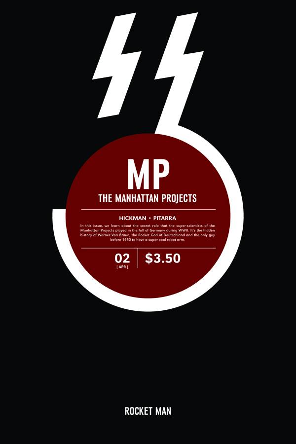 "ROCKET MAN" In this issue, we learn about the secret role that the super-scientists of THE MANHATTAN PROJECTS played in the fall of Germany during WWII. It's the hidden history of Werner Von Braun, the rocket god of Deutschland and the only guy before 1950 to have a super-cool robot arm. One of the most anticipated new series of the year continues THE MANHATTAN PROJECTS #2: ROCKET MAN!