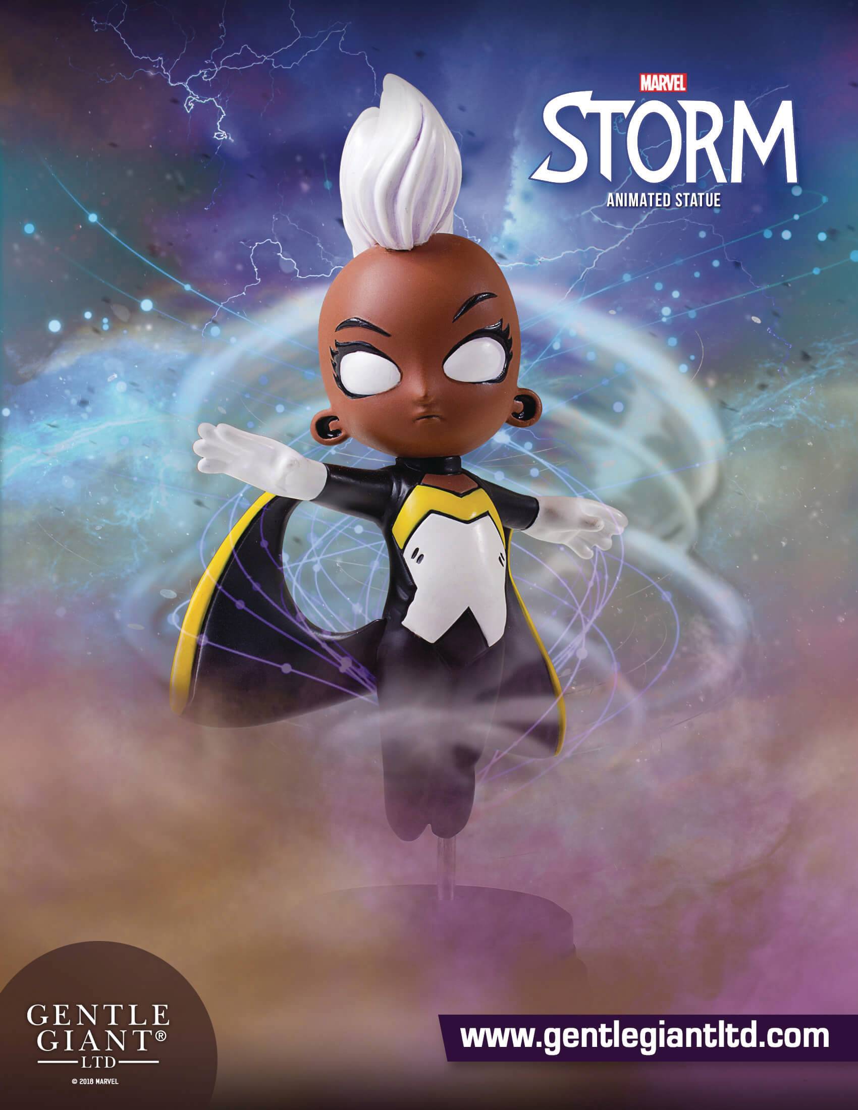 Ororo Munroe, aka Storm, is one of the most powerful mutants in history, with the mutant ability to control weather patterns. Storm is a natural born leader and in addition to being a Queen has also found herself the leader of The New Mutants, The Morlocks, and the X-Men. Storm is the 20th release in Gentle Giant's popular line of Marvel animated statues and this piece is based on the variant cover for Storm #1 by fan-favorite artist Skottie Young. The regal Storm is depicted using her powers to hover over her base with her signature white Mohawk and cape blowing in the breeze. The Storm Animated Statue was digitally sculpted and carefully printed on state of the art 3D Systems 3D printers. The high-resolution prints were then used in the creation of prototypes needed to produce this animated collectible. Each animated statue is hand-cast, hand-painted, and hand-numbered with a limited edition Certificate of Authenticity.