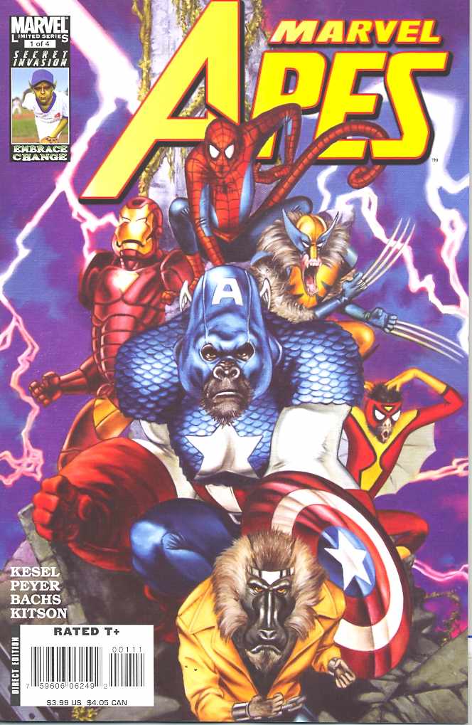Written by KARL KESEL Pencils by RAMON BACHS Cover by JOHN WATSON Variant Cover by RAMON BACHS Flingin' feces, True Believer-- the entire Marvel Universe has gone APE! Just when he thinks life can't get any worse or weirder, Marty Blank - a.k.a. that lovable loser, the Gibbon -- finds himself and the brilliant-and-beautiful Dr. Fiona Fitzhugh transported to a world where monkeys rule and humans don't exist! SEE the spectacular simian city of Monkhattan! MEET the hominoid heroes and villains - SPIDER-MONKEY! DOC OOK! IRON MANDRILL! SIMIAN TORCH! THE APE-VENGERS! And more! THRILL to the return of Speedball! CONTAINS No-Ads, as we are thrilled to present you backup tales exploring the Apeiverse! LEARN the dark secret of the primate planet! WORRY that the fate of the entire universe is in the hands of the Gibbon! Not a hoax, not a dream, not an imaginary story - just the most not-to-be-missed mini-series of the season! If you only buy one (well, two) comics this month about super-powered, intelligent apes-in-capes, it must be MARVEL APES! 40 PGS./ Rated T+ ...$3.99