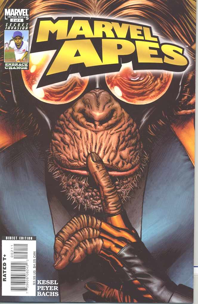Written by KARL KESEL Pencils by RAMON BACHS Cover by JOHN WATSON Variant Cover by PHIL JIMENEZ Flingin' feces, True Believer-- the entire Marvel Universe has gone APE! Just when he thinks life can't get any worse or weirder, Marty Blank - a.k.a. that lovable loser, the Gibbon -- finds himself and the brilliant-and-beautiful Dr. Fiona Fitzhugh transported to a world where monkeys rule and humans don't exist! SEE the spectacular simian city of Monkhattan! MEET the hominoid heroes and villains - SPIDER-MONKEY! DOC OOK! IRON MANDRILL! SIMIAN TORCH! THE APE-VENGERS! And more! THRILL to the return of Speedball! CONTAINS No-Ads, as we are thrilled to present you backup tales exploring the Apeiverse! LEARN the dark secret of the primate planet! WORRY that the fate of the entire universe is in the hands of the Gibbon! Not a hoax, not a dream, not an imaginary story - just the most not-to-be-missed mini-series of the season! If you only buy one (well, two) comics this month about super-powered, intelligent apes-in-capes, it must be MARVEL APES! 40 PGS./ Rated T+ ...$3.99