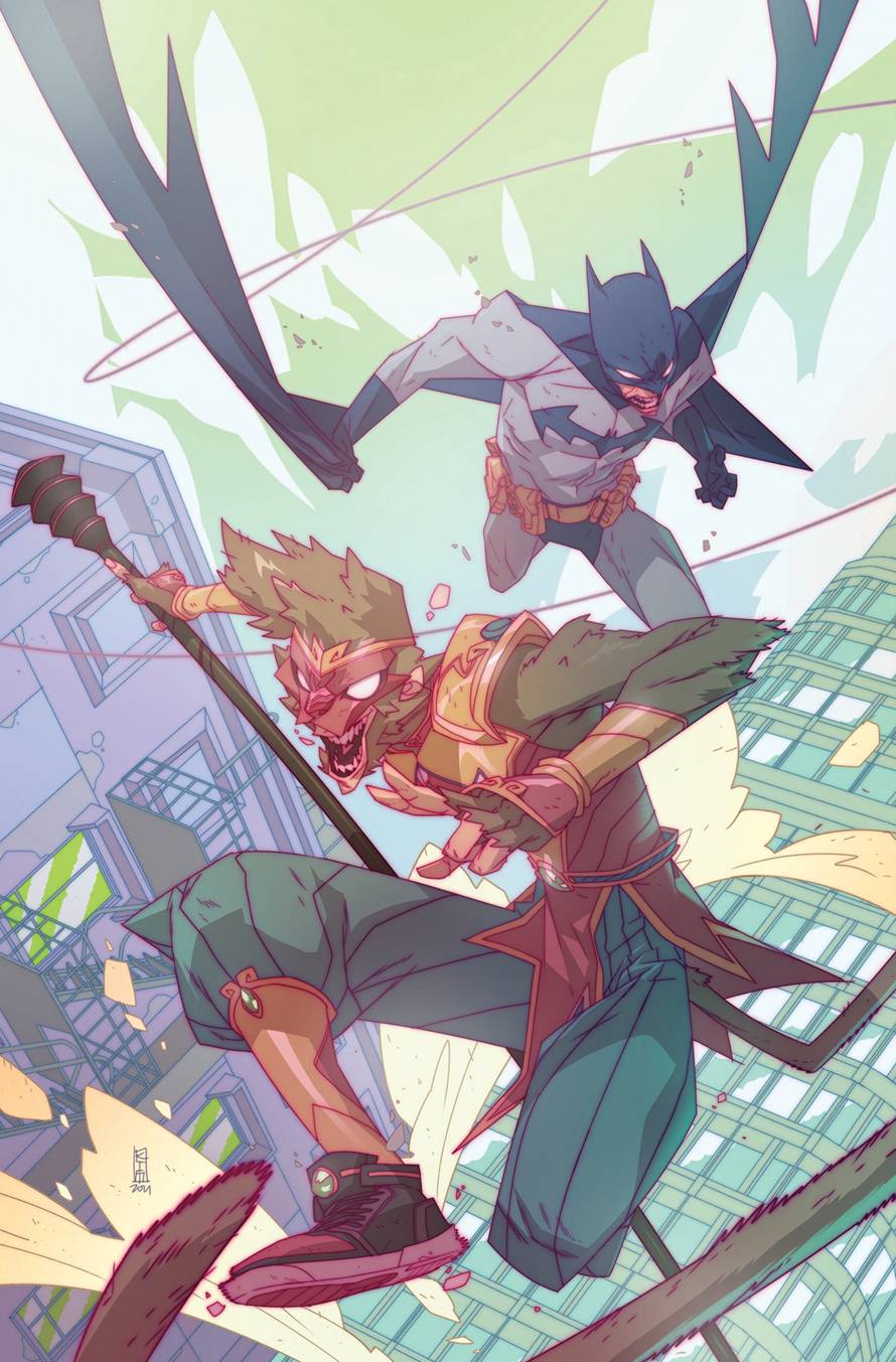 The bat's out of the bag as Monkey Prince and Pigsy both realize what all the demon spirits around the world are after-eating specific superheroes in order to gain their powers! And this penguin demon has his eyes on...Batman! Uh-oh, Monkey Prince, it's bad enough you have to keep hiding your tail when you're Marcus, and how your circlet keeps returning latched onto your body as something else every time you try to get rid of it-but now cannibalism is also on the menu? YEOW!
