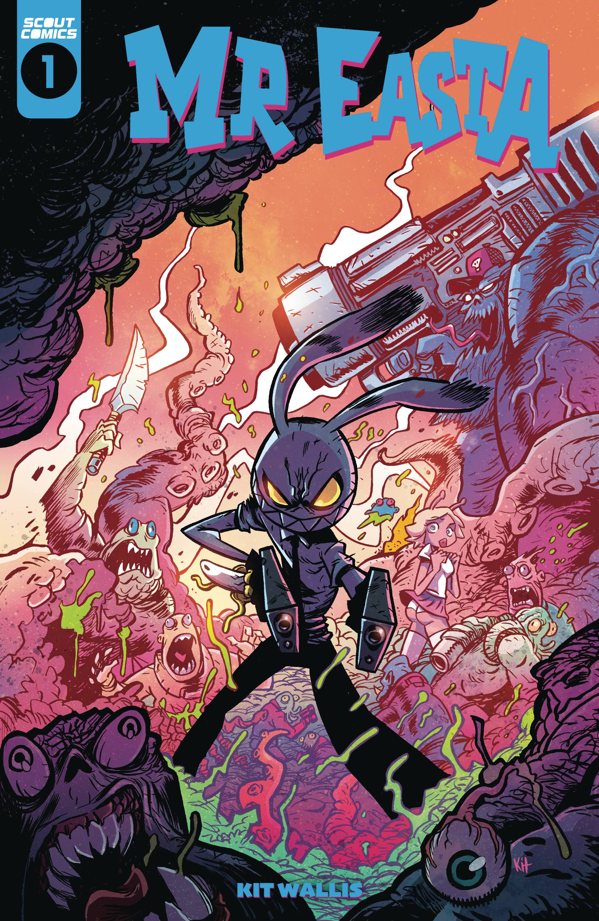 The gloriously demented mind of Kit Wallis brings the galactic adventures of the third best assassin in the universe to Scout Comics! Incredible, kinetically charged artwork blasts the blood, mayhem and quirky humor directly through your brain like a high-caliber bullet. In this issue, it's Elvis night at an interstellar backwater bar, but with all due respect to the King, that doesn't stop Mr. Easta. With the help of Frank, his teleportation parasite, who can also transform into any handheld weapon imaginable, it's business as usual.
